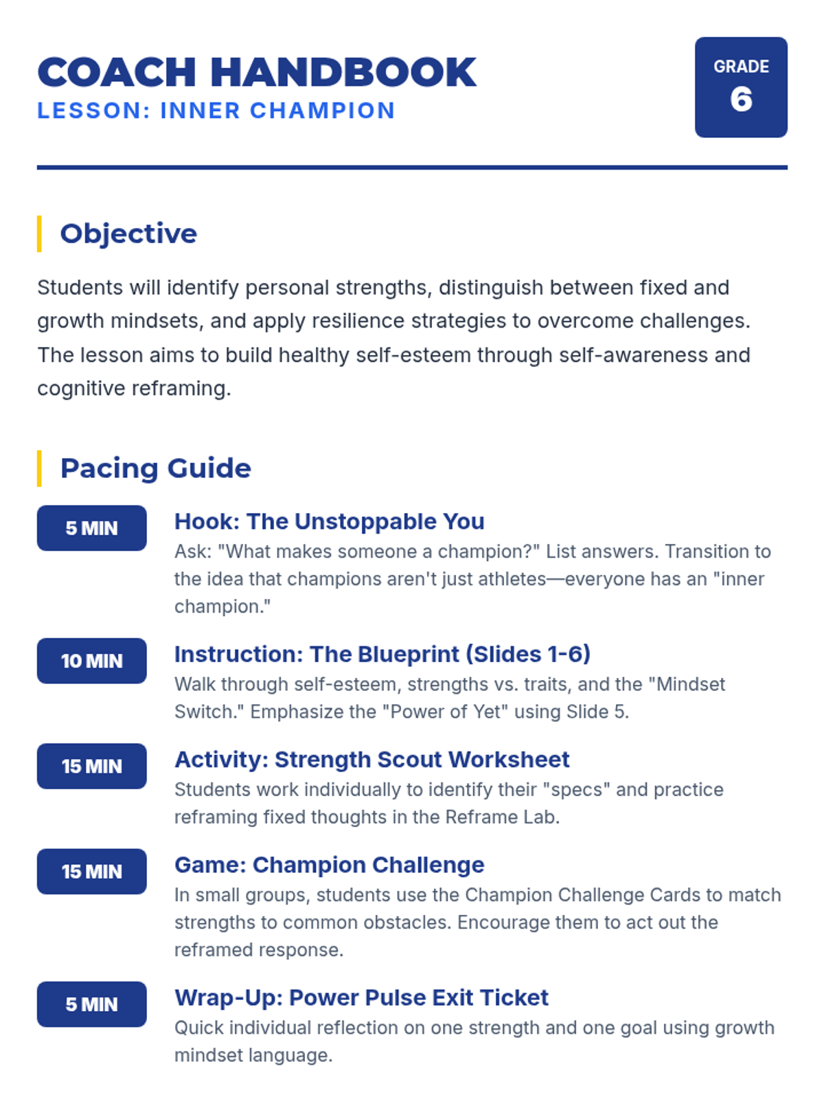 An updated teacher guide that incorporates the 'Champion Challenge' card game into the pacing guide and provides specific differentiation tips for the activity. Features improved page breaks and formatting.