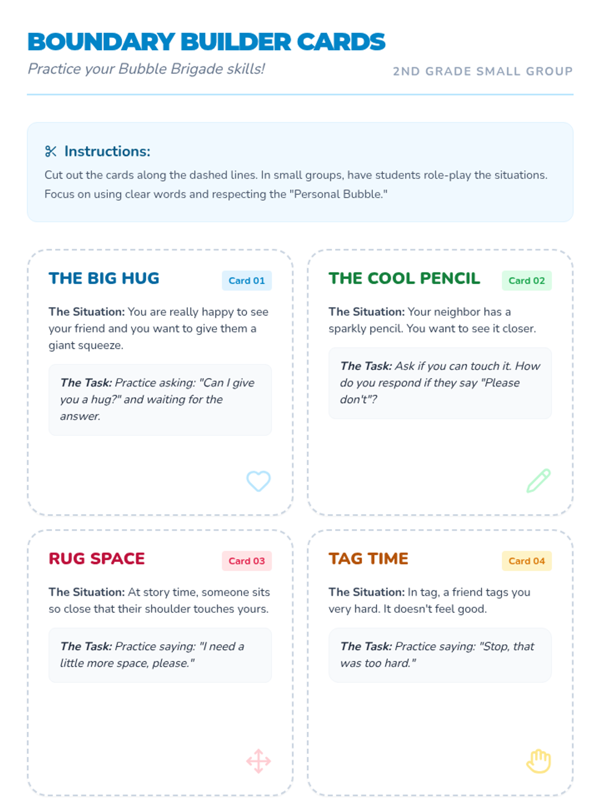 A set of 6 printable role-play cards for small group activities, providing scenarios for 2nd graders to practice setting and respecting personal boundaries. (Revised for page breaks and text layout)