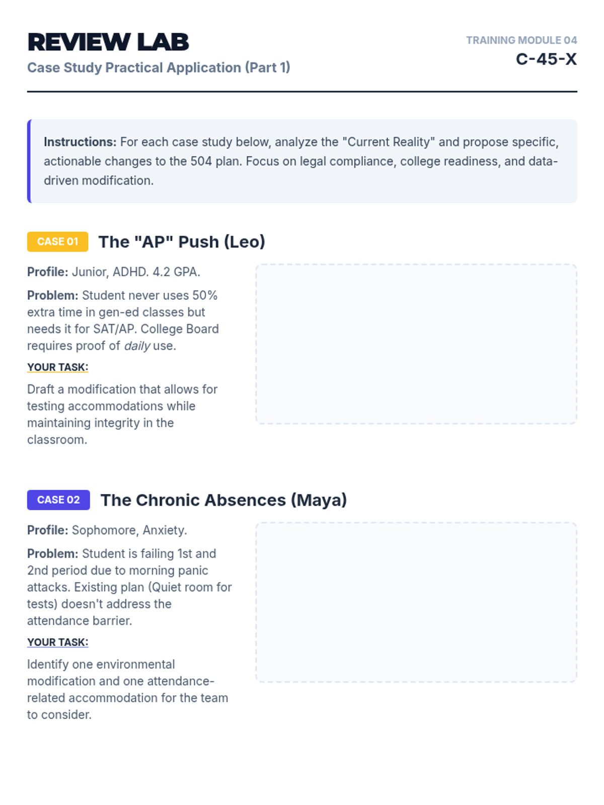 A hands-on worksheet featuring four specific high school 504 case studies, designed for counselors to practice drafting modifications, transition goals, and compliance responses. Increased workspace provided.