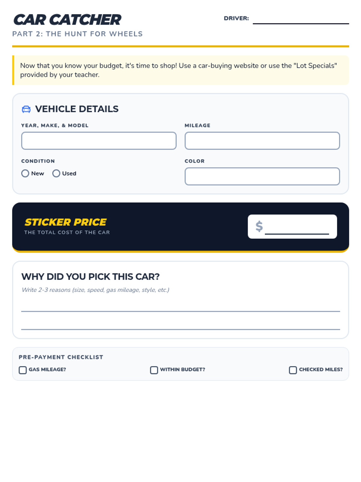A car-shopping worksheet where students record details for a vehicle. Optimized for a single-page layout with dark response lines and improved visibility of student work areas.