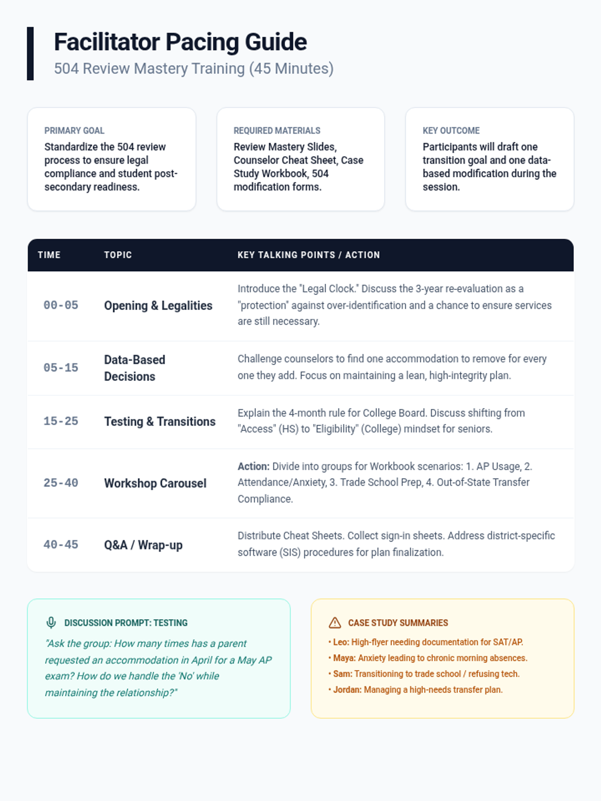 A detailed 45-minute facilitator pacing guide for trainers, providing timed modules, talking points, and interactive workshop prompts for the 504 training session. Consolidated to one page.