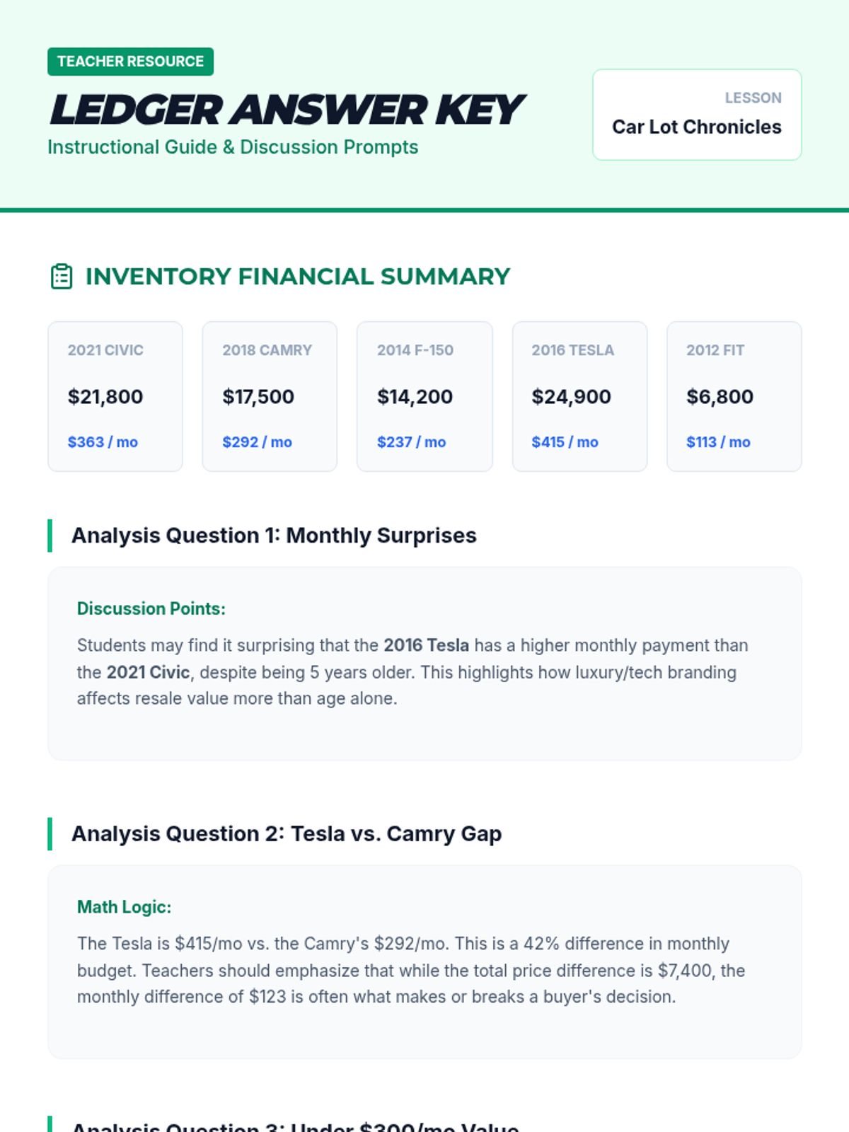 A teacher's guide and answer key for the Dealership Ledger worksheet. Includes specific financial analysis of the car inventory, including total prices and monthly payment comparisons. Revised for markdown consistency.