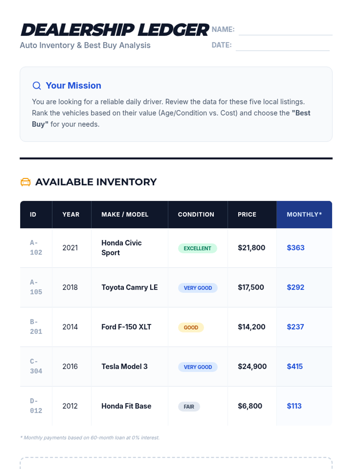 A comparison worksheet featuring an inventory table of 5 cars with both total price and monthly payment estimates. Students analyze the financial data to select and justify a 'Best Buy' vehicle. Revised with better spacing and work areas.