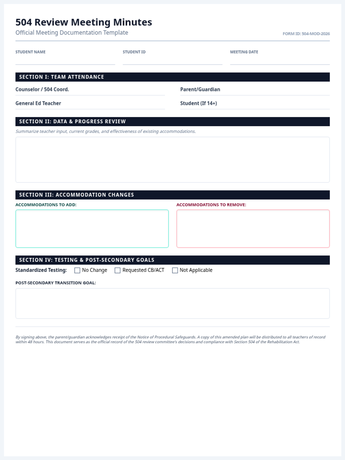 A formal, high-quality meeting minutes template for documenting 504 review meetings, including sections for attendance, data review, accommodation modifications, and transition goals. Optimized for single-page printing and grayscale legibility.
