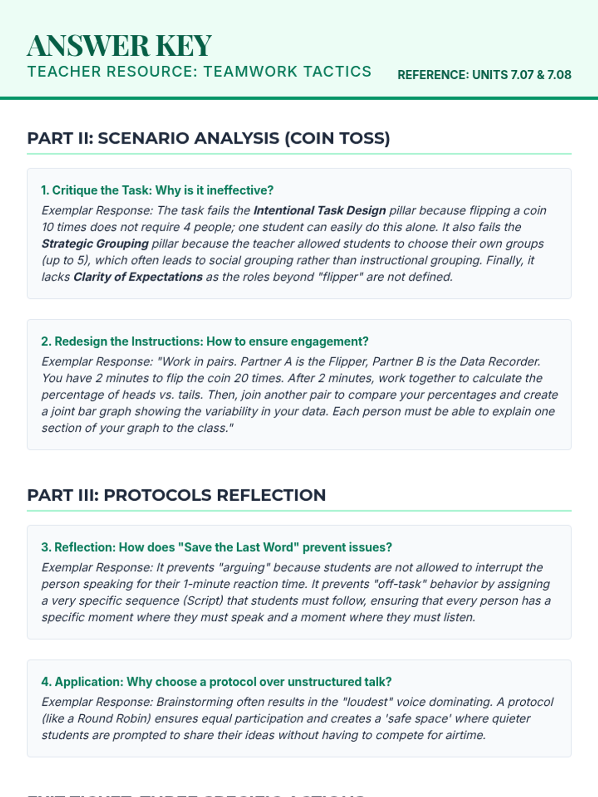 A detailed answer key for the Teamwork Tactics worksheet, providing exemplar responses for the coin-toss scenario analysis, protocol reflections, and the exit ticket. Includes instructional tips for teacher-training facilitators.