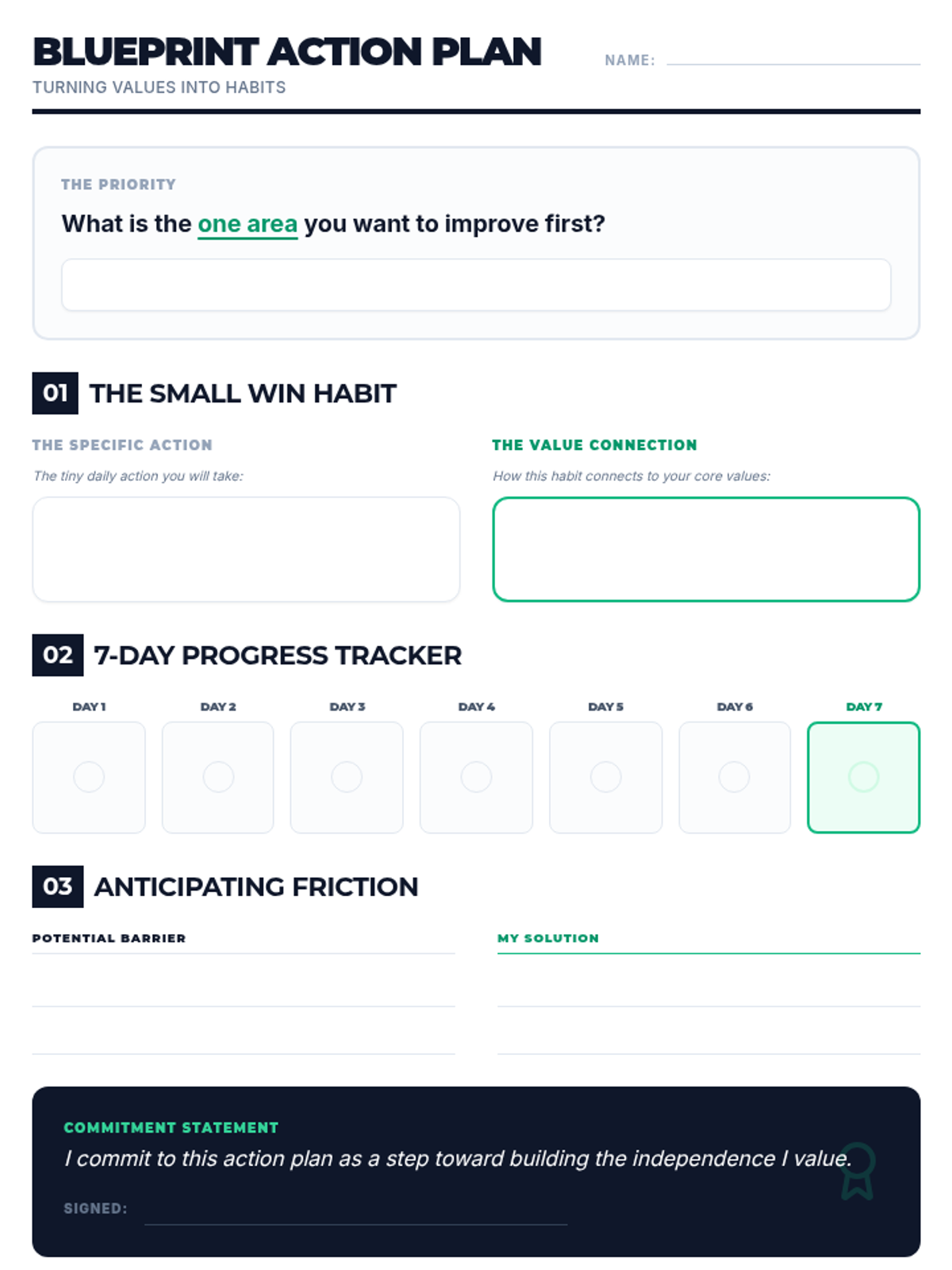 A condensed, high-impact 7-day habit-tracking worksheet that fits on a single page. It turns core values into a concrete action plan by focusing on a single priority, a small daily habit, and anticipating obstacles.