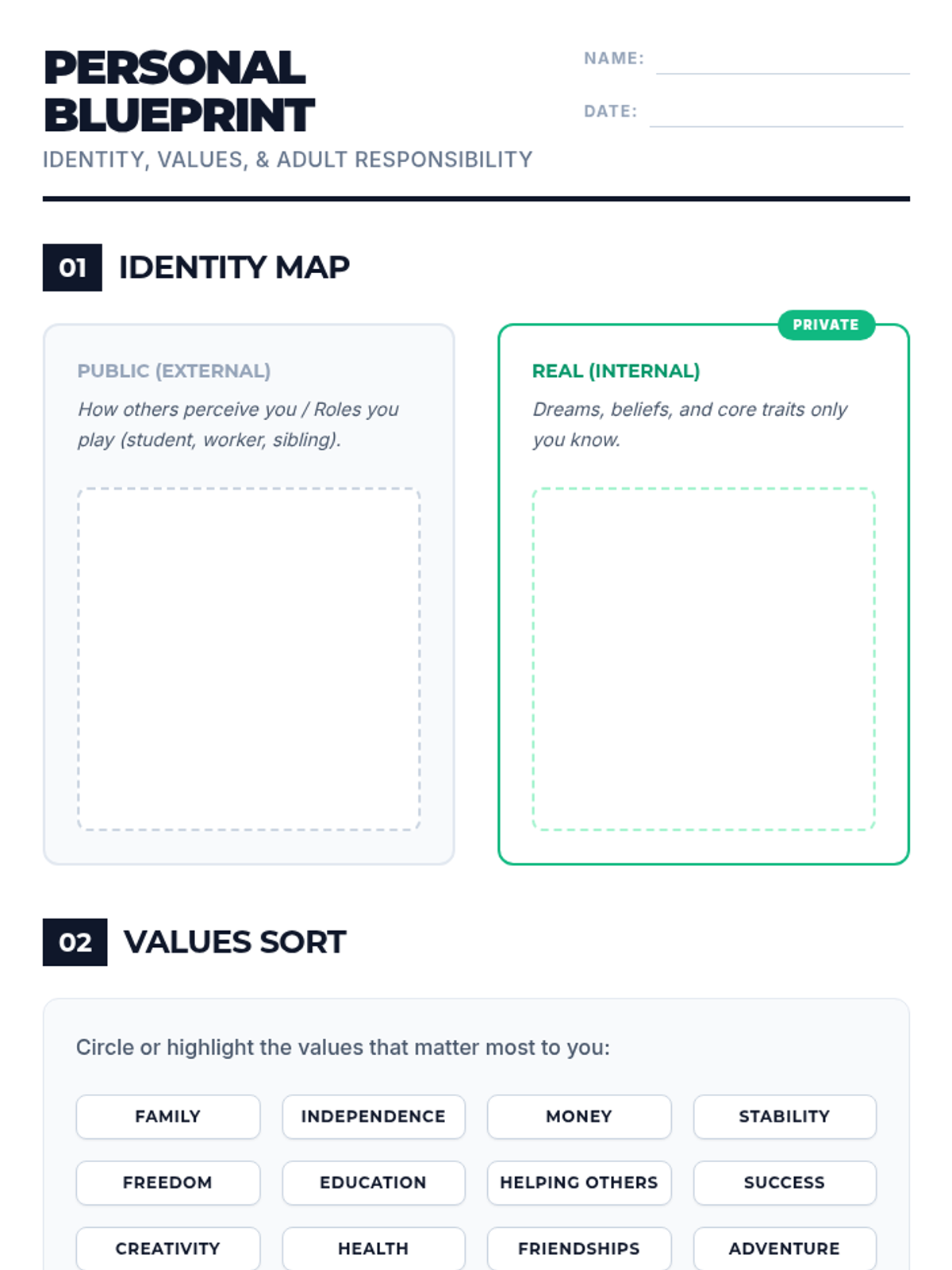 A 3-page comprehensive personal development worksheet for young adults focusing on identity mapping, values prioritization, and responsibility management. Revised for better page breaks and contrast.