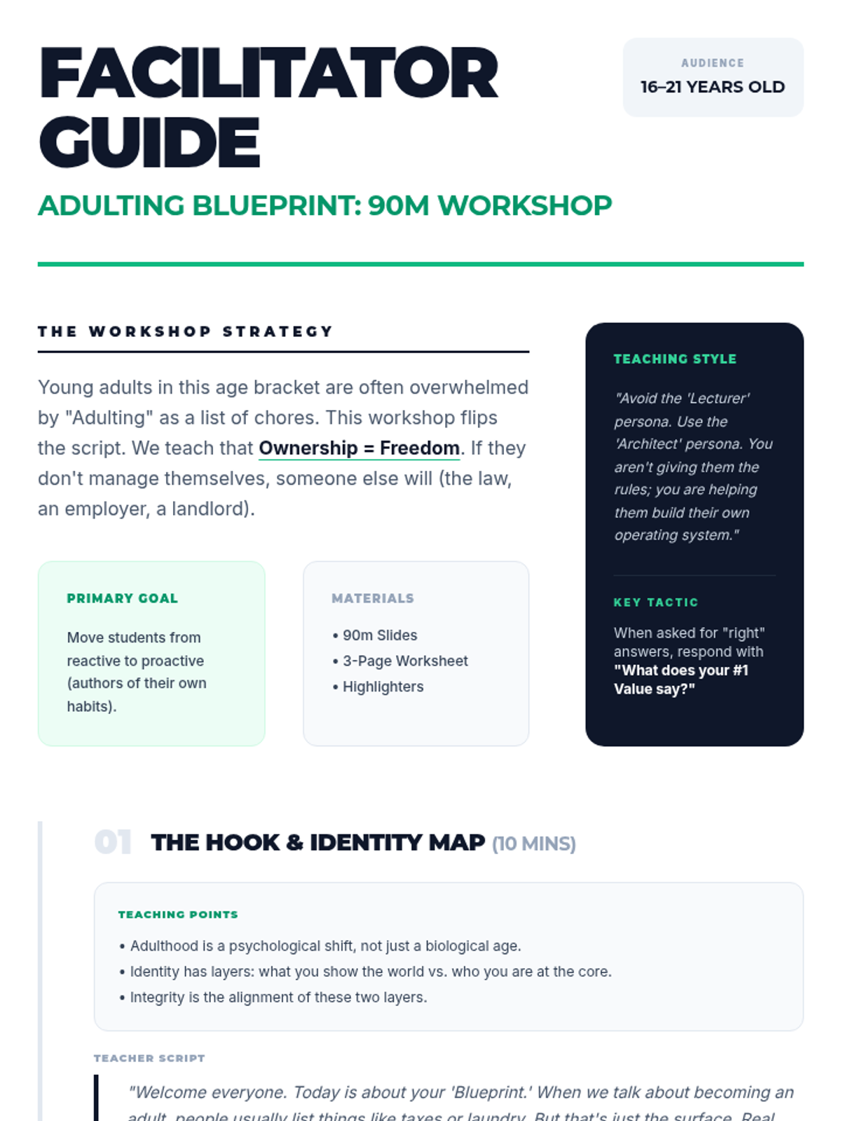 A comprehensive facilitator guide for the 90-minute Adulting Blueprint workshop. Revised to fix page breaks, sidebar overflows, and maintain chronological order.