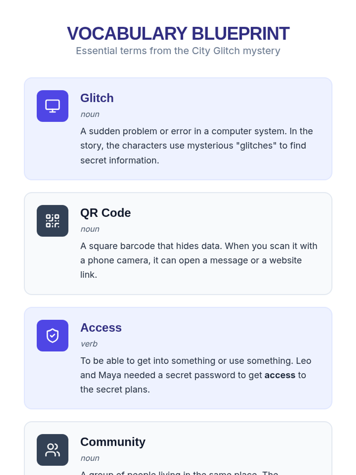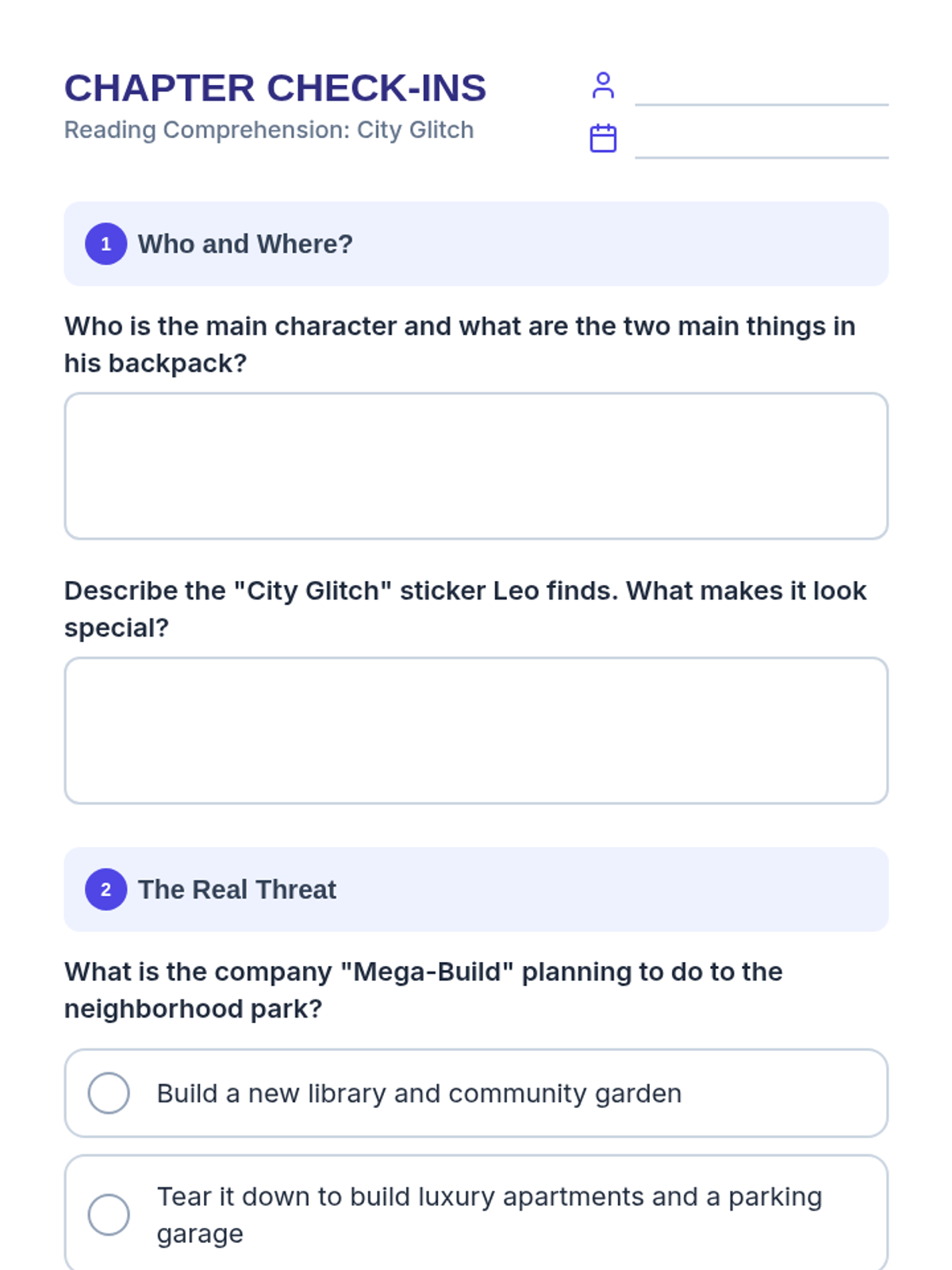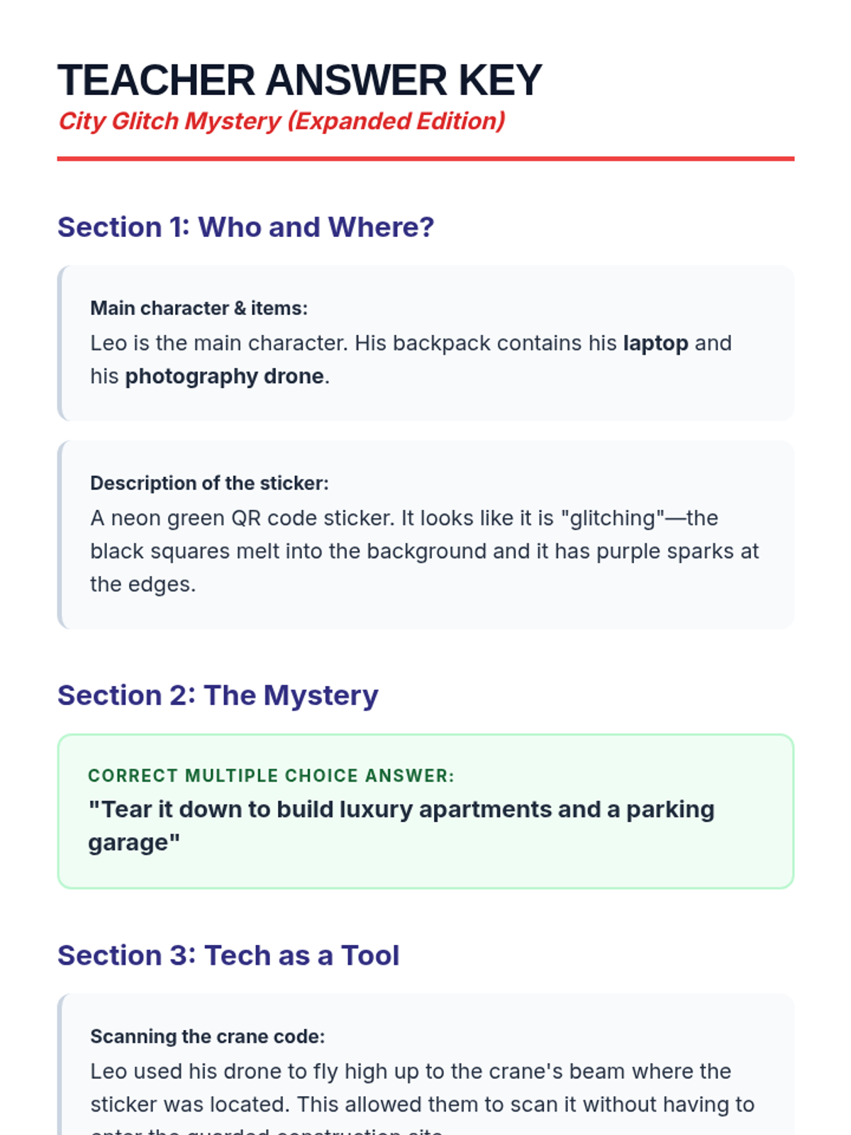 Updated teacher answer key to match the expanded "City Glitch" story and revised worksheet questions.