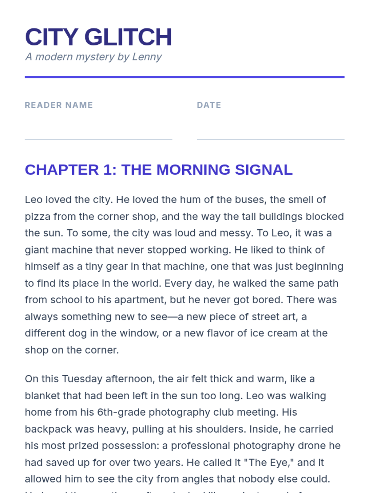 A significantly expanded 2,000-word fictional story about two middle schoolers using technology and mystery-solving skills to save their local park. The story is written at a 6th-grade reading level and features large text and clear headers for accessibility. Protagonists are correctly identified as 6th graders to align with user request.