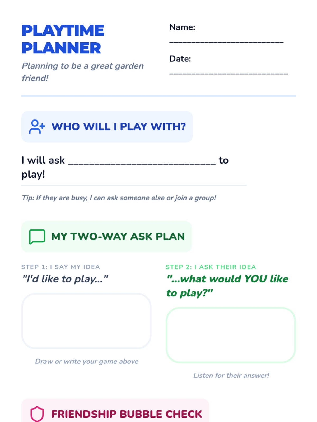 A student worksheet to help plan social interactions, practicing the "Two-Way Ask" and pre-rehearsing game choices and personal space boundaries.