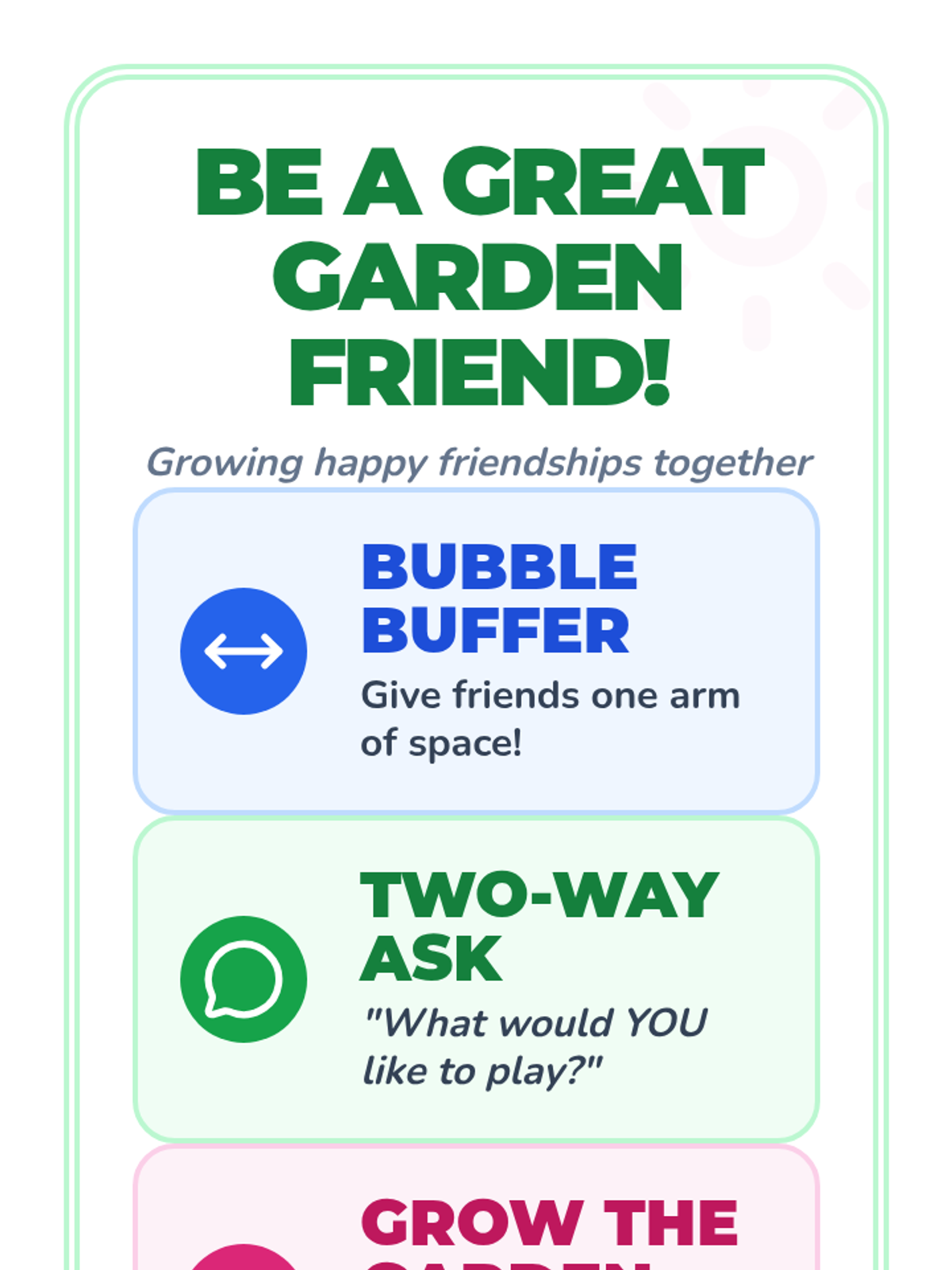 A high-visibility classroom poster reminding students of the three core friendship rules: Bubble Buffer (personal space), Two-Way Ask (cooperative play), and Growing the Garden (inclusion).