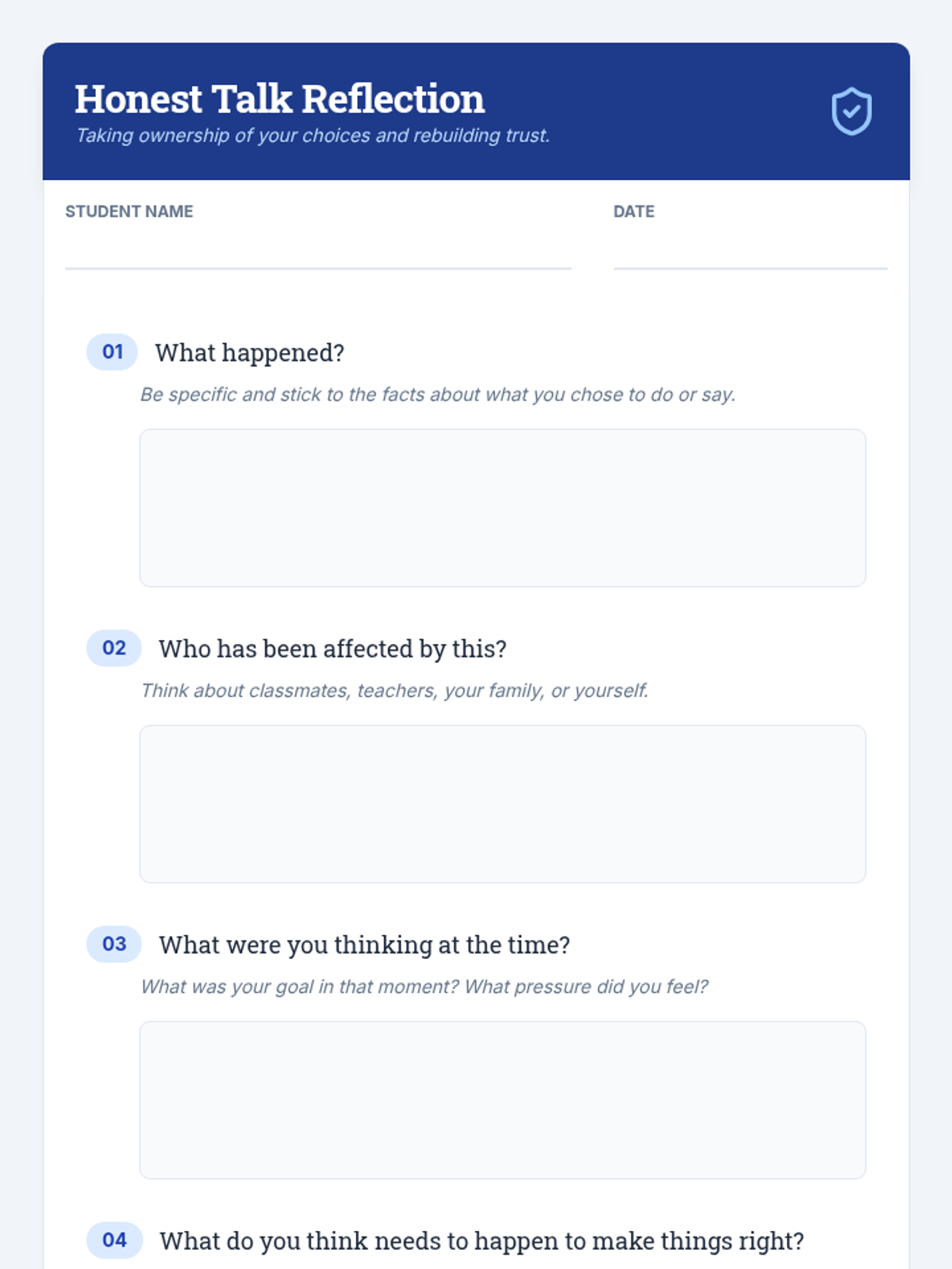 A one-on-one reflection sheet for middle school students to process incidents involving dishonesty, focusing on facts, impact, motivations, and repair steps.