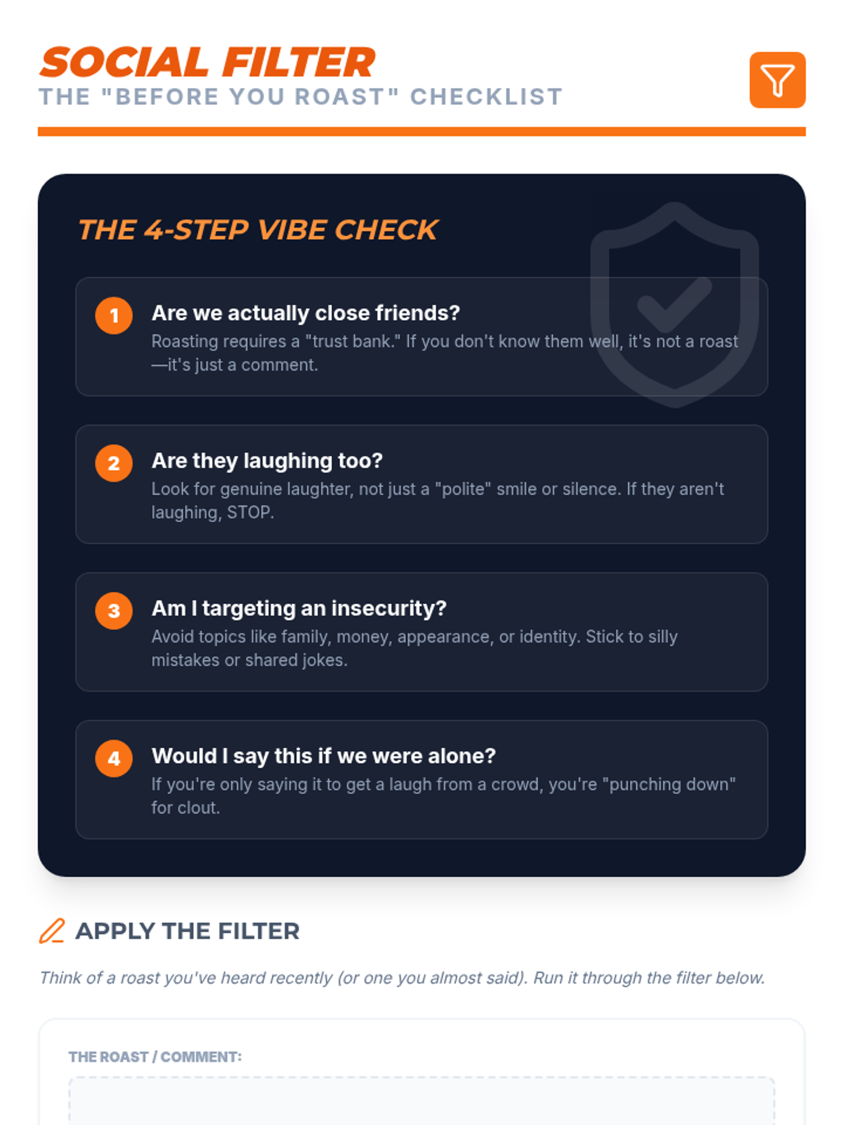A student-facing 'Social Filter' checklist handout that provides a 4-step framework for self-monitoring social humor and includes a practice section for real-world application.