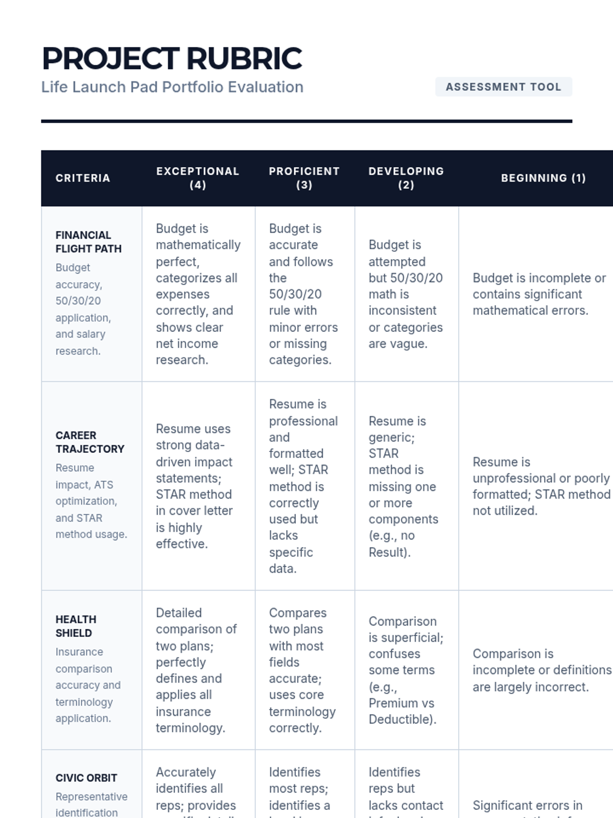 A professional grading rubric for the Life Launch Pad PBL project, covering financial, career, health, and civic criteria.