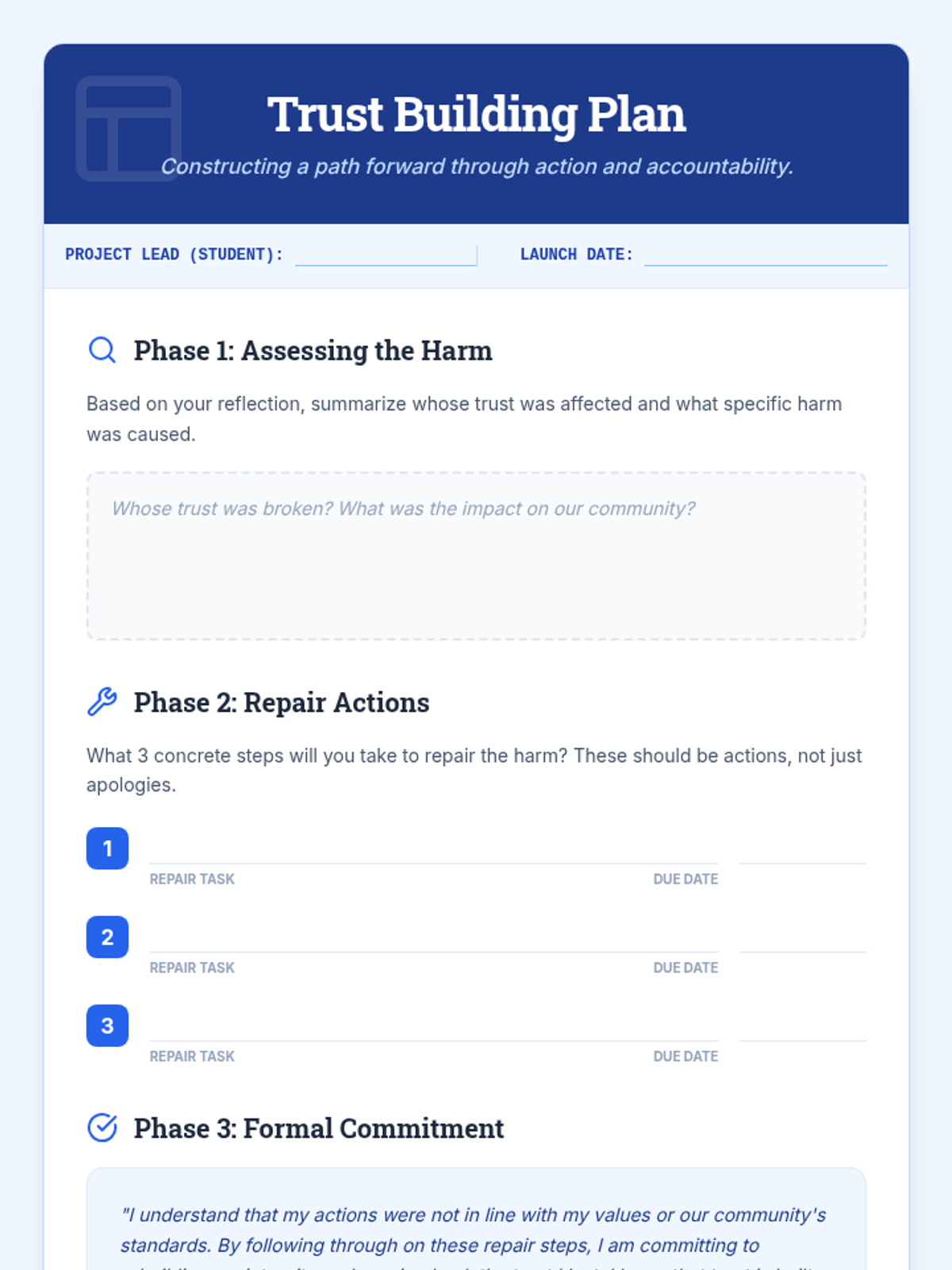 A collaborative contract for students to create actionable steps for repairing trust after an incident involving dishonesty, including phases for assessing harm, repair actions, and formal commitment.
