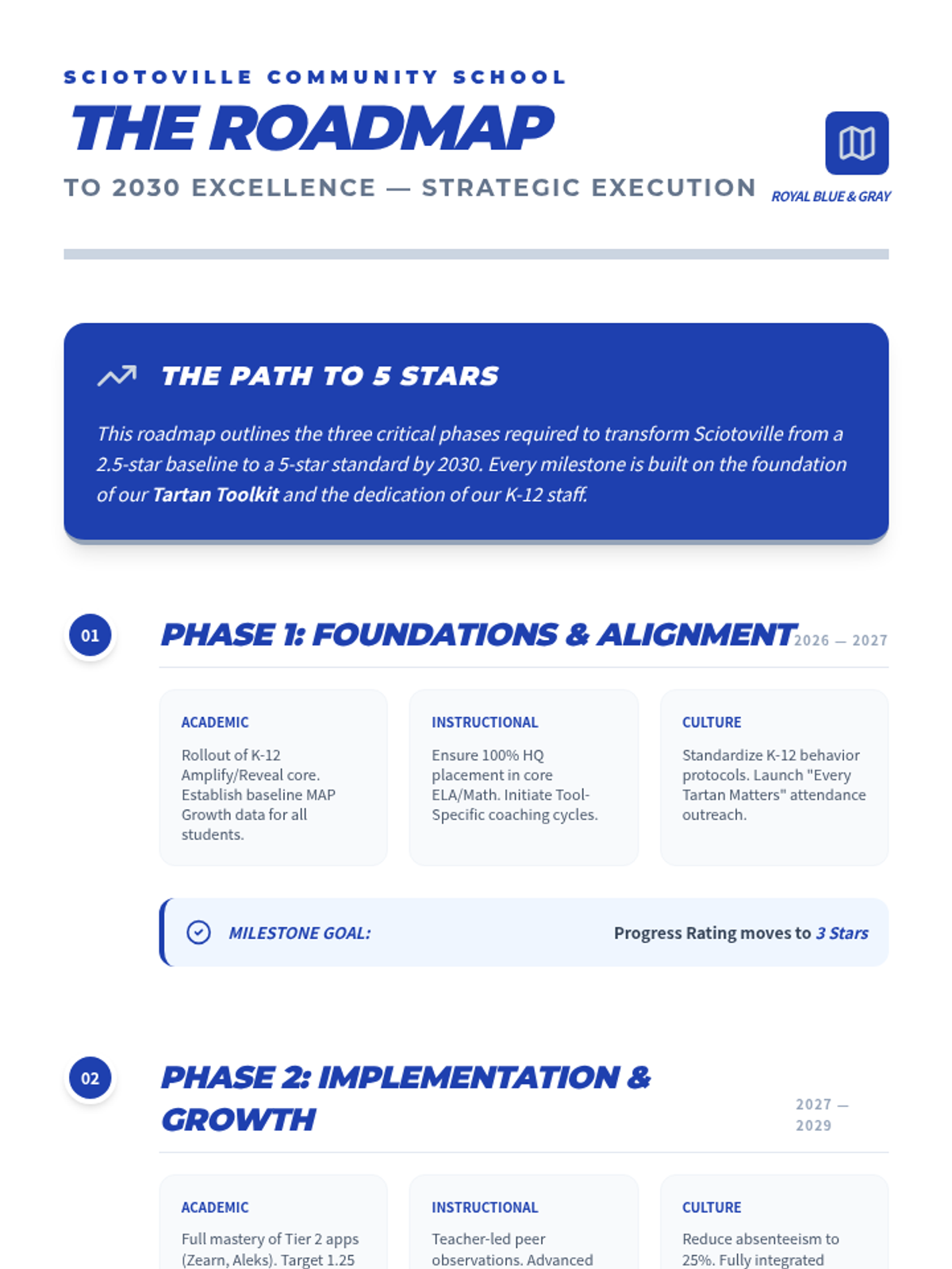 A comprehensive strategic roadmap for Sciotoville Community School, detailing the phased transition from the 2026 baseline to 2030 excellence targets across three distinct implementation phases.