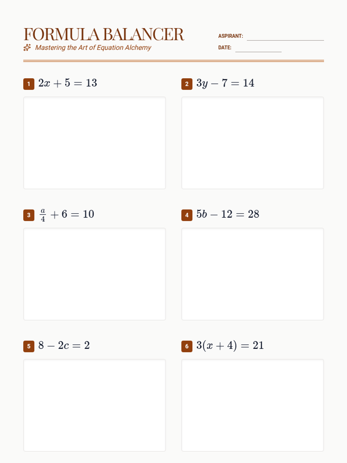 A visual guide to solving two and three-step equations using an alchemy theme. Includes clear step-by-step breakdowns of inverse operations and distribution.