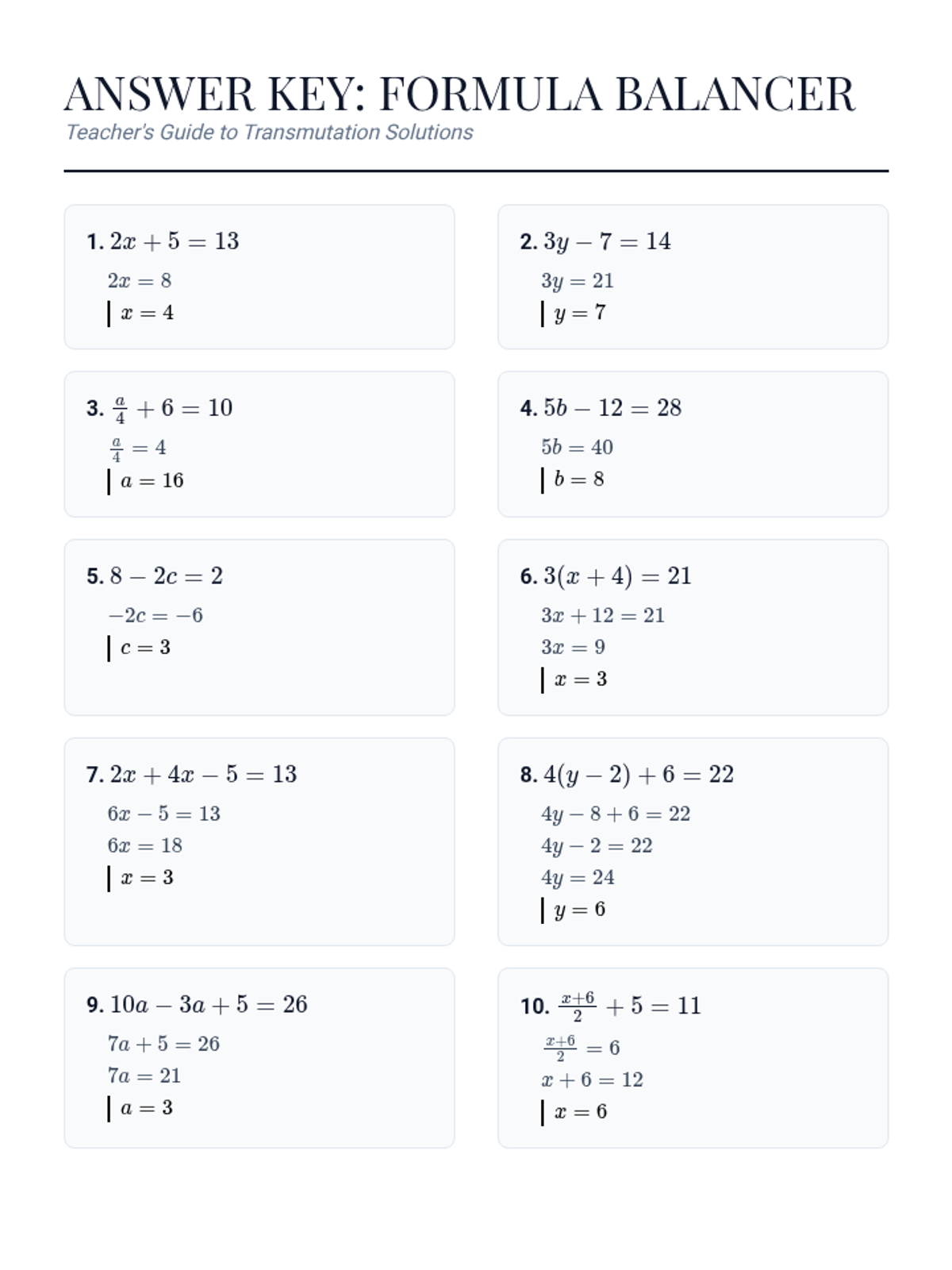 A clear and detailed answer key for the Formula Balancer Worksheet, showing major steps for each of the 10 problems.