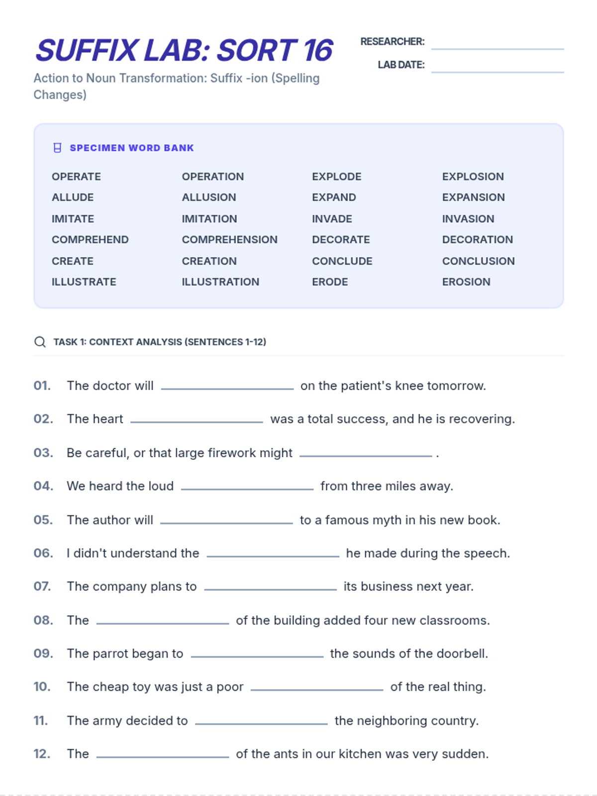 A 3-page printable packet for Sort 16 (-ion). Includes 24 fill-in-the-blank sentences across two pages, followed by a logic page with 6 word unscrambles and a functional 12x12 crossword puzzle.