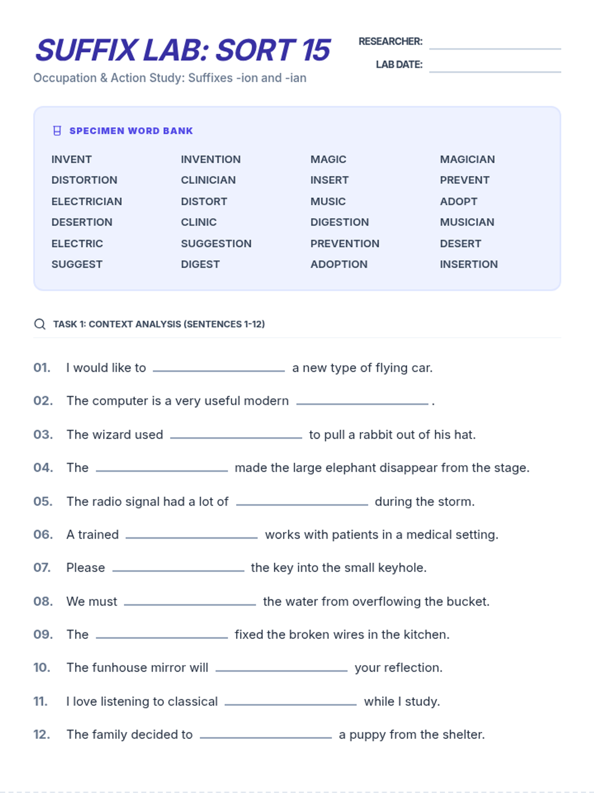 A 3-page printable packet for Sort 15 (-ion, -ian). Includes 24 fill-in-the-blank sentences across two pages, followed by a logic page with 6 word unscrambles and a functional 12x12 crossword puzzle.