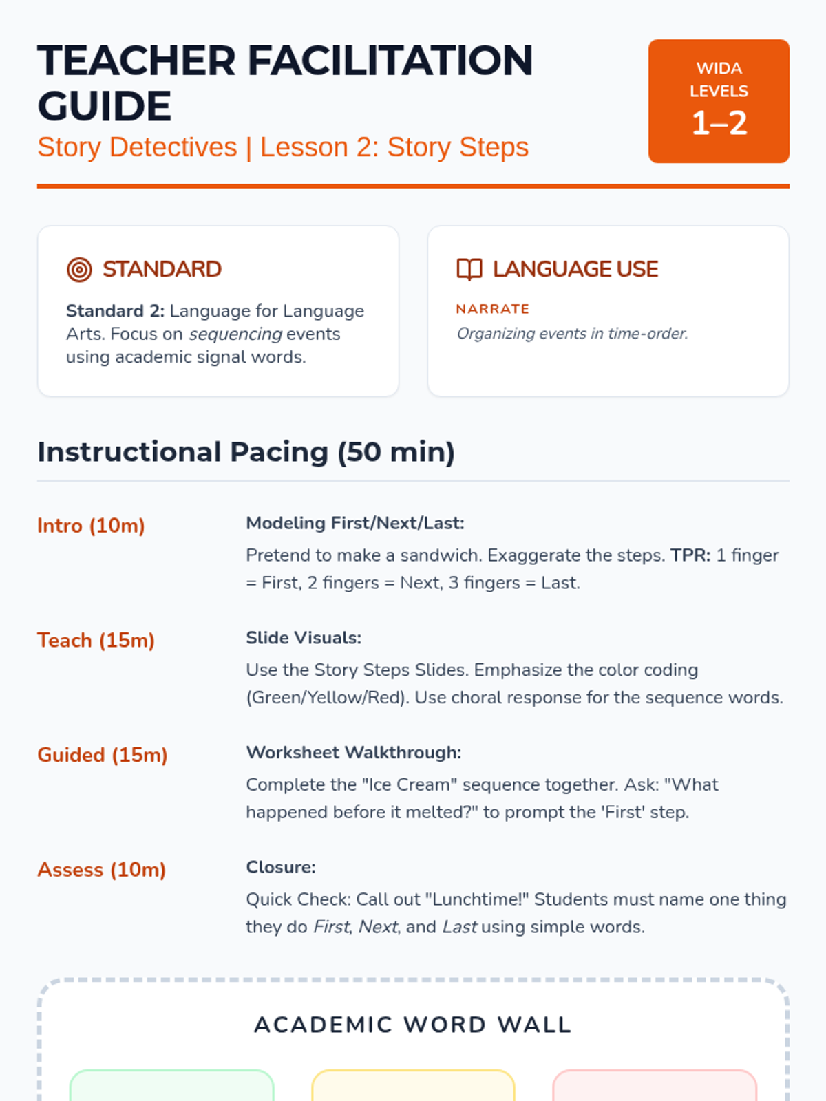 A teacher guide for the second lesson of the Story Detectives sequence. Pacing and layout have been adjusted to prevent content orphans, and color contrast has been improved for the academic vocabulary section.