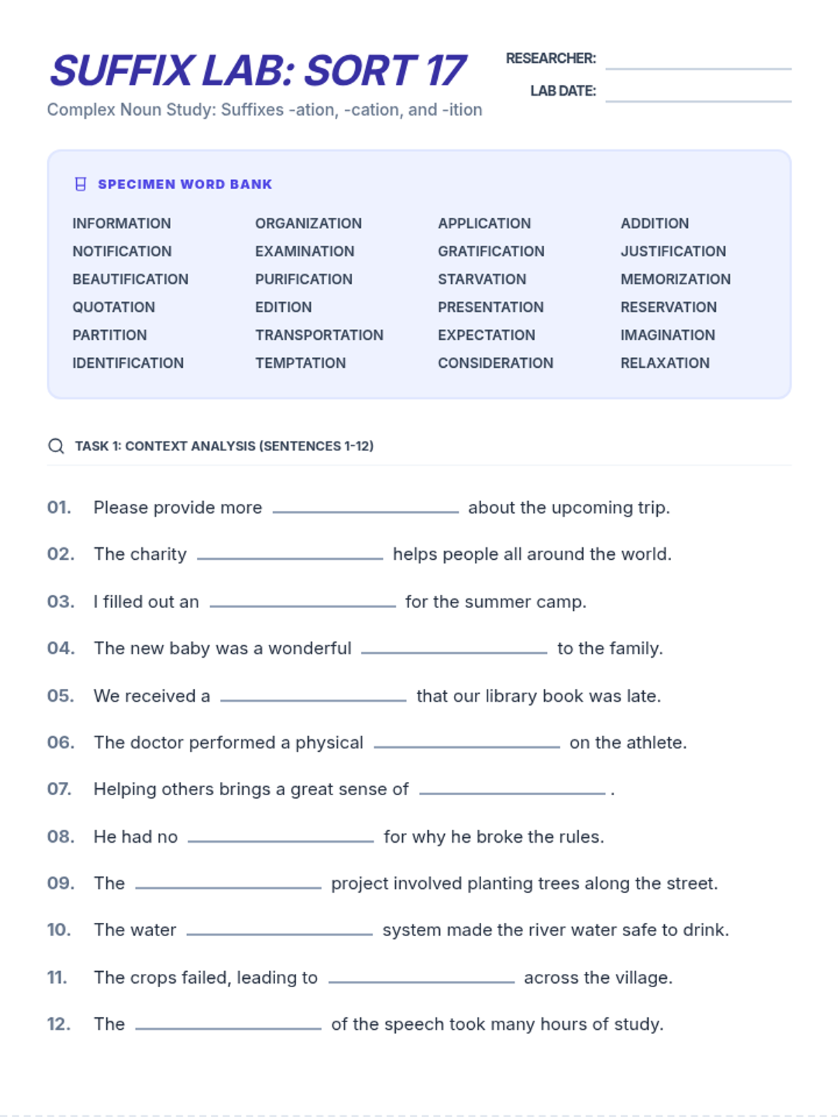 A 3-page printable packet for Sort 17 (-ation, -cation, -ition). Includes 24 fill-in-the-blank sentences across two pages, followed by a logic page with 6 word unscrambles and a functional 12x12 crossword puzzle.
