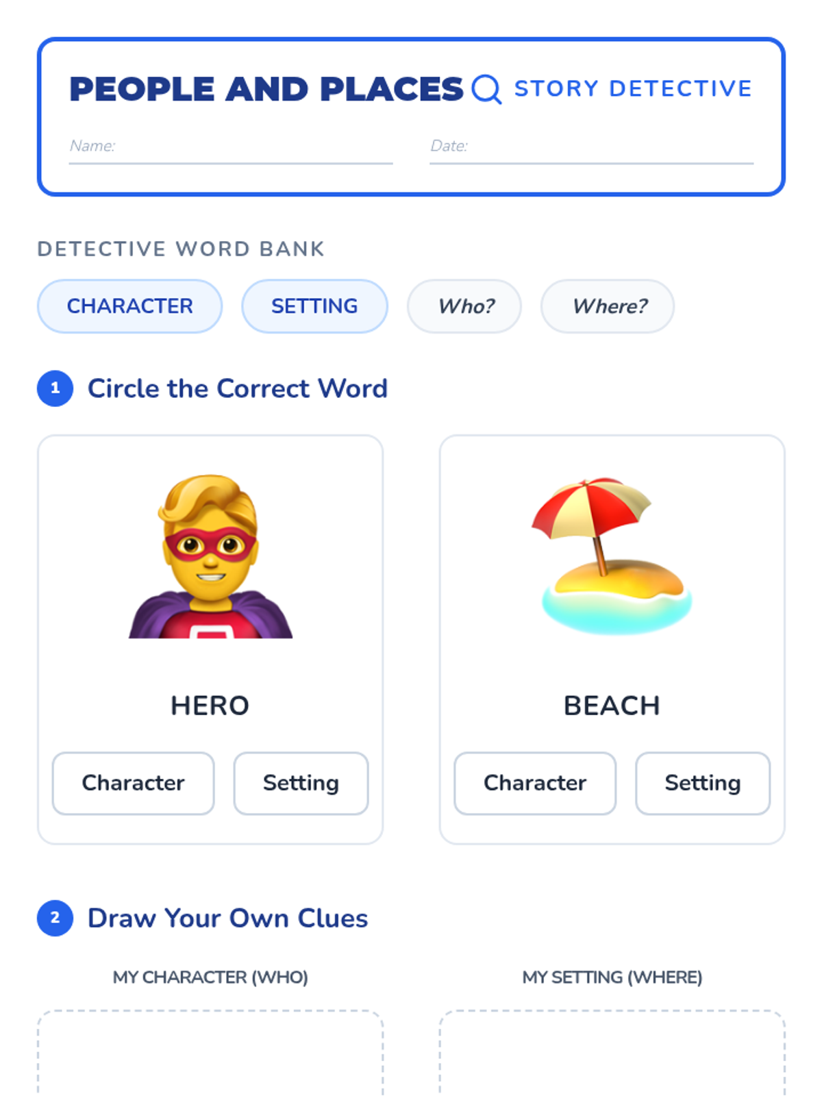 A scaffolded student worksheet for WIDA Level 1-2 students to practice identifying characters and settings through circling, labeling, and drawing. Correct answers now share uniform styling to ensure pedagogical validity.