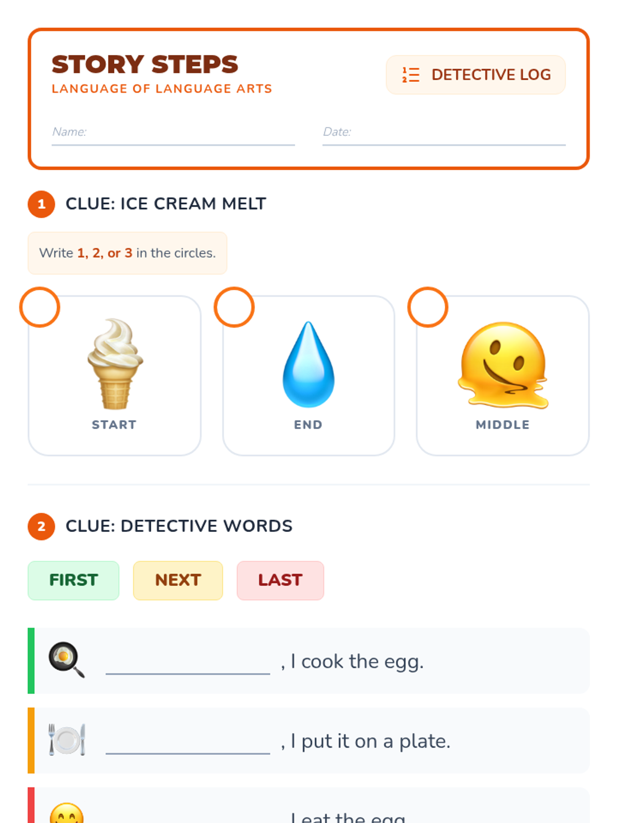 A scaffolded sequencing worksheet for WIDA Level 1-2 students. Sections are now logically grouped to prevent page-break issues, student work areas are significantly expanded, and underscores have been replaced with solid handwriting lines.