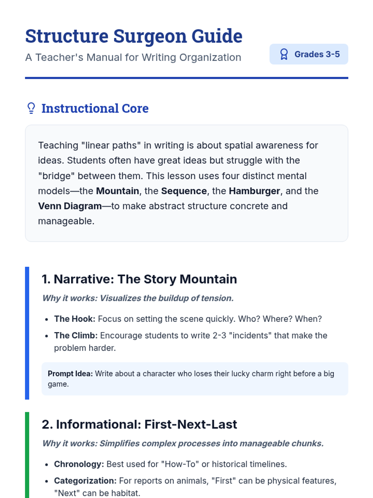 A professional teaching guide for the Writing Blueprint lesson. It provides instructional strategies for each organizational model, creative writing prompts, and a success criteria checklist to help teachers assess student work effectively.