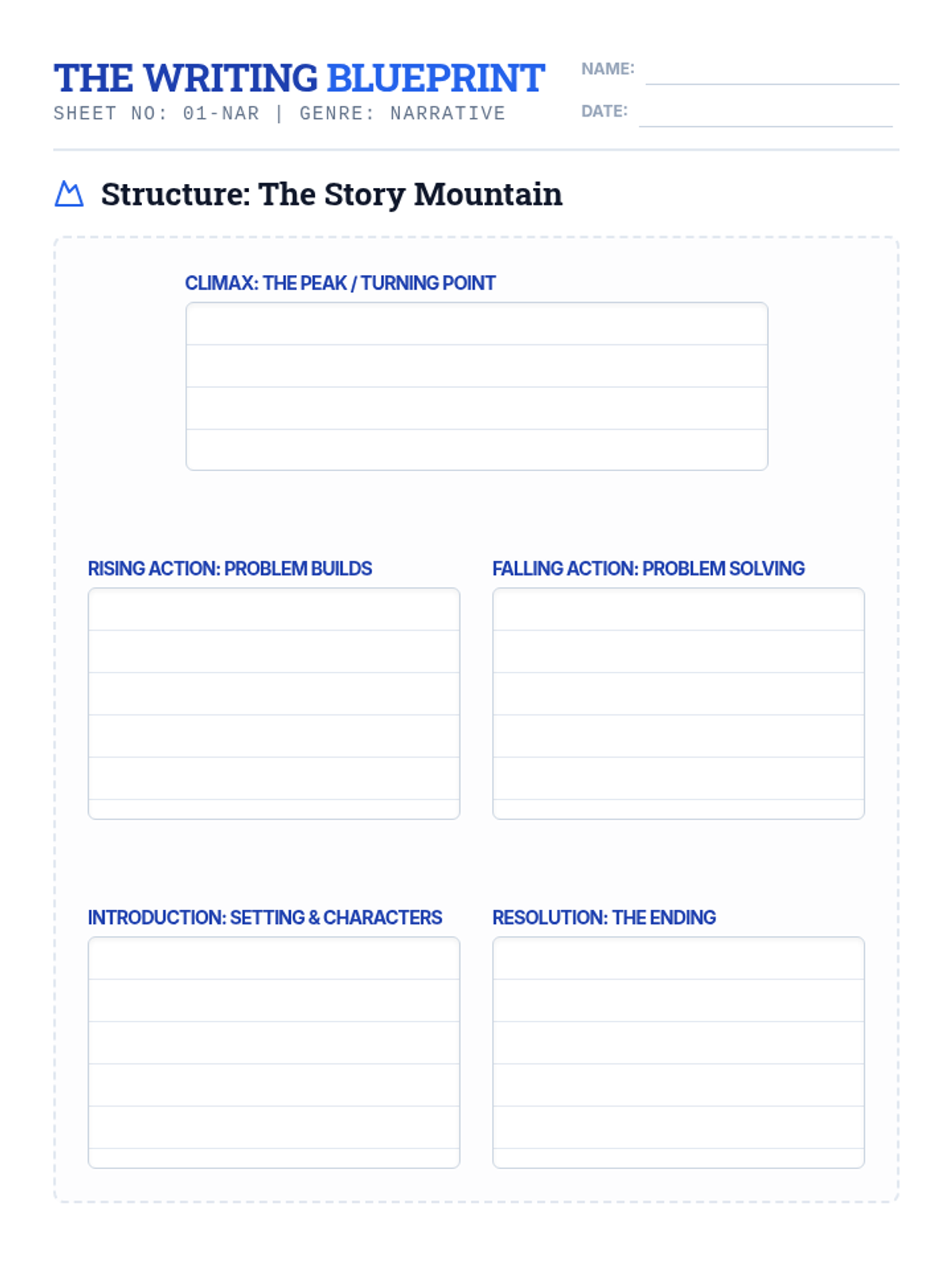 A 3-page printable organizer toolkit for students. It includes a Story Mountain for narrative planning, a First-Next-Last template for informational writing, and a Hamburger Map for opinion essays. Each page is styled with a blueprint theme and provides spacious, light-colored work areas for student handwriting.