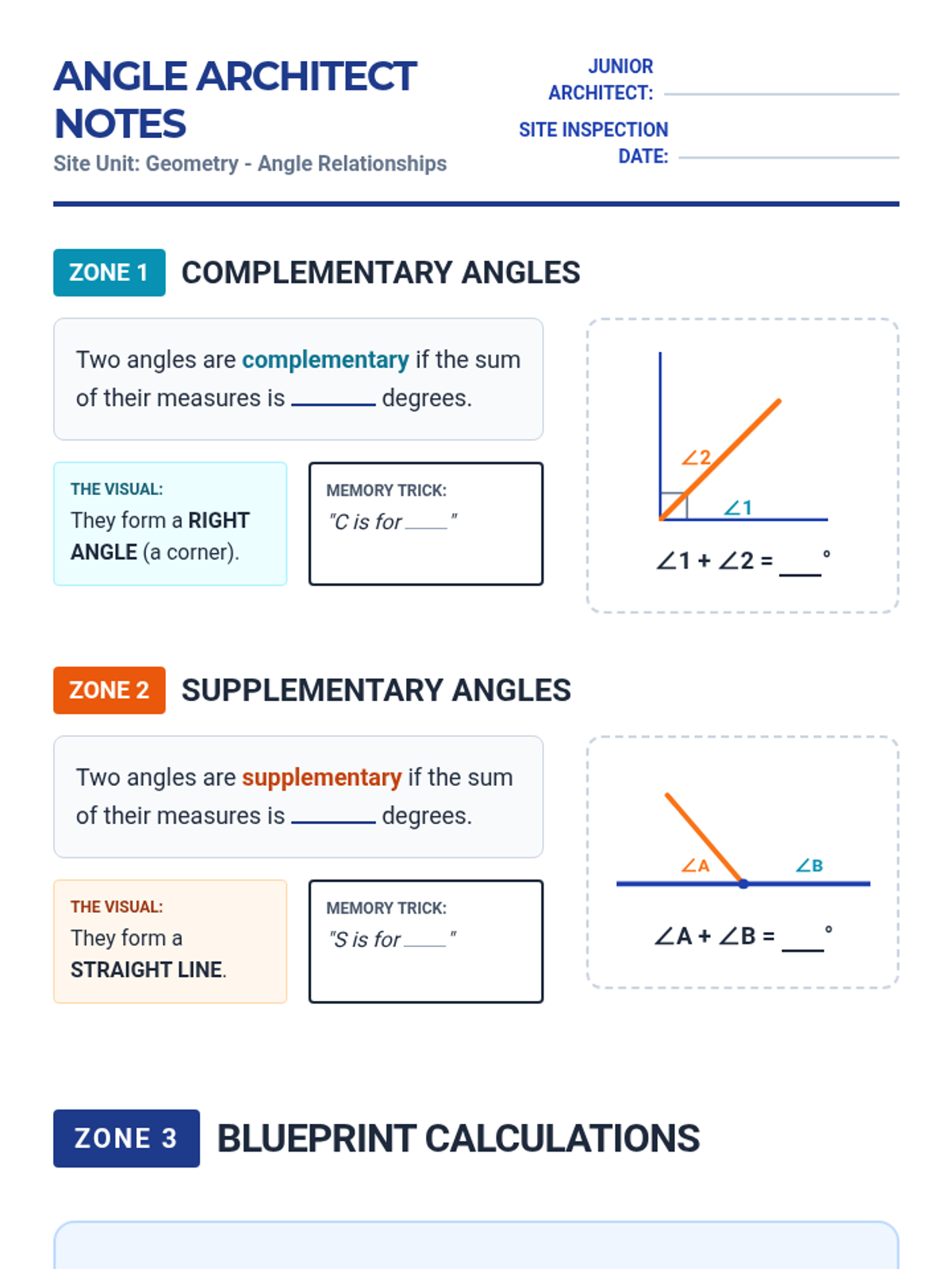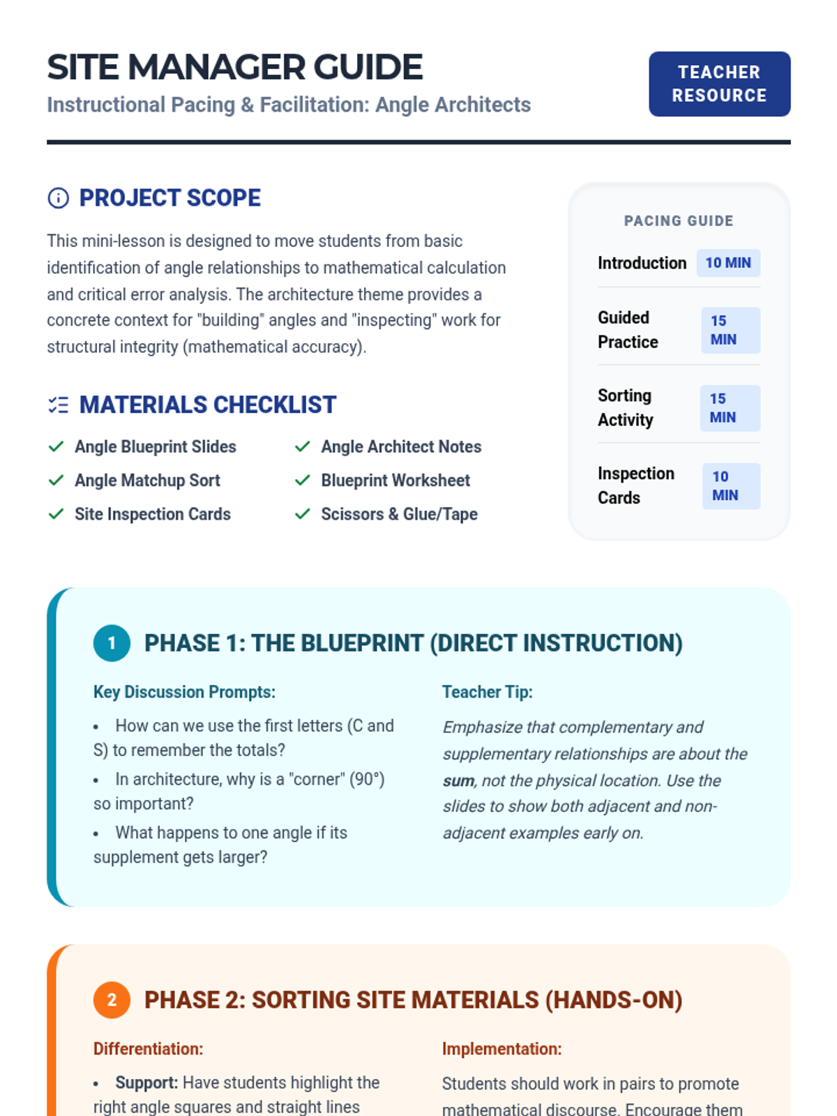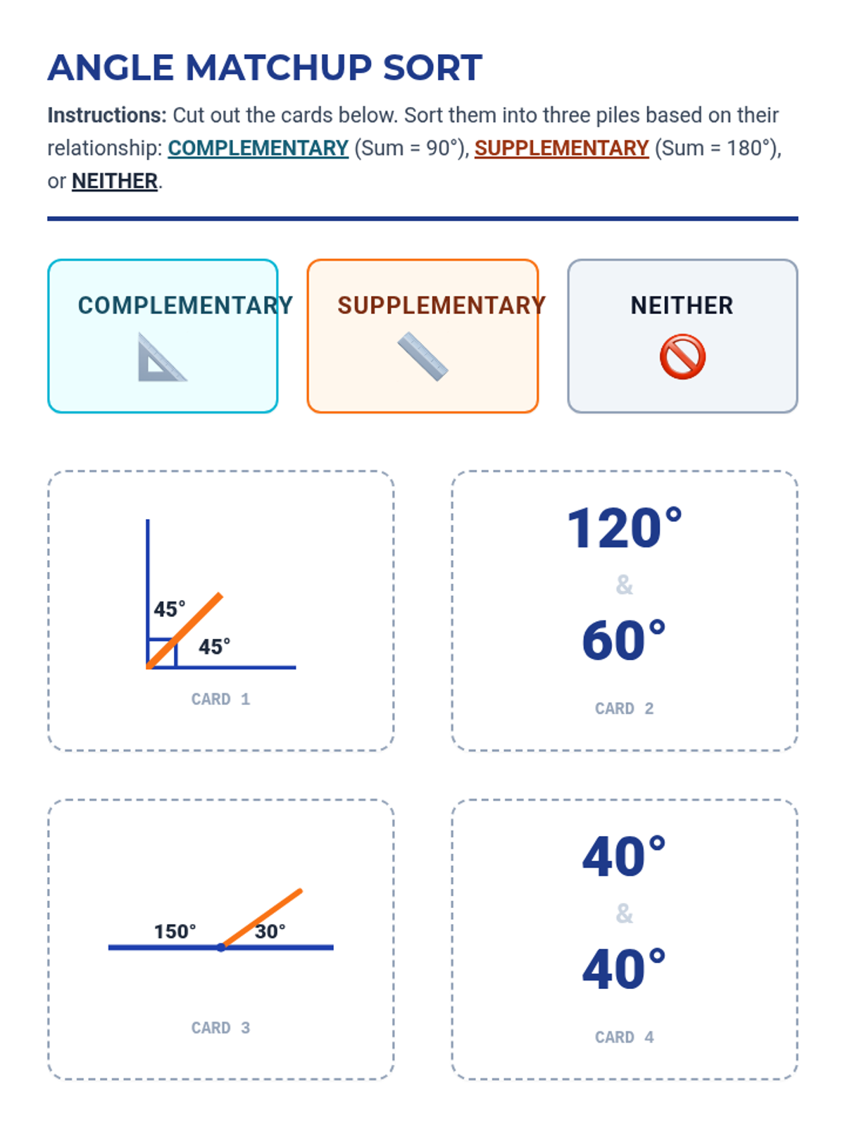 A hands-on activity where students sort angle cards into 'Complementary', 'Supplementary', or 'Neither'. It includes visual diagrams, numeric pairs, and descriptive text to support all learners.
