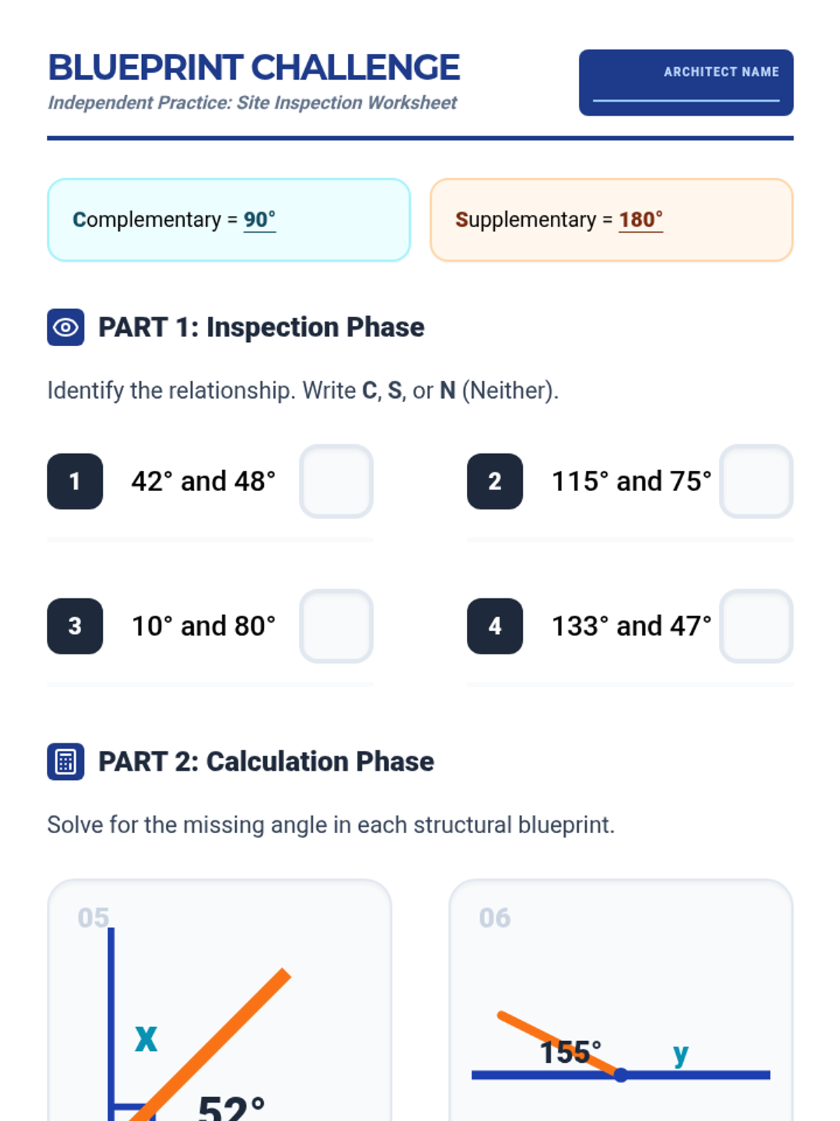 An independent practice worksheet titled 'Blueprint Challenge' that tests students on identifying and calculating complementary and supplementary angles. It includes diagram-based problems and word-problem scenarios.