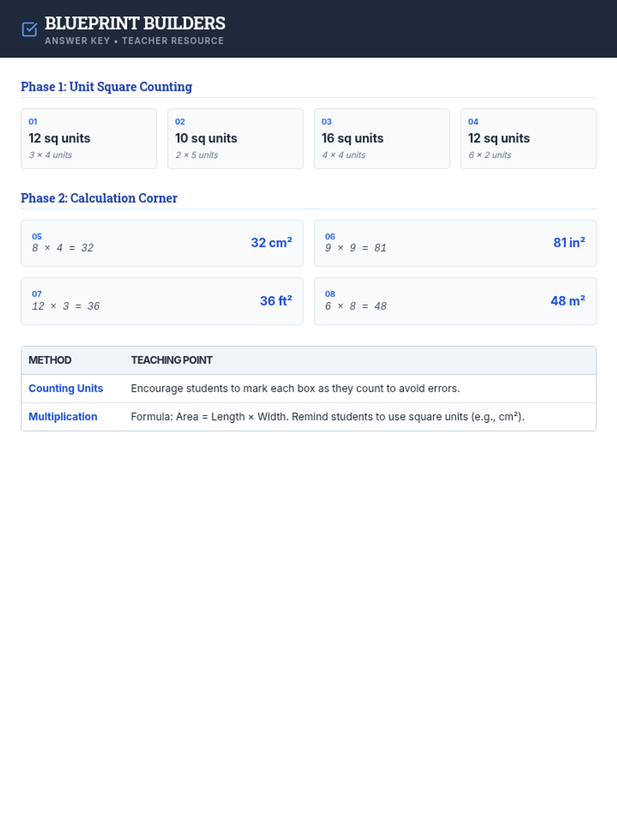 Answer key for the Blueprint Builders Worksheet with step-by-step calculations.