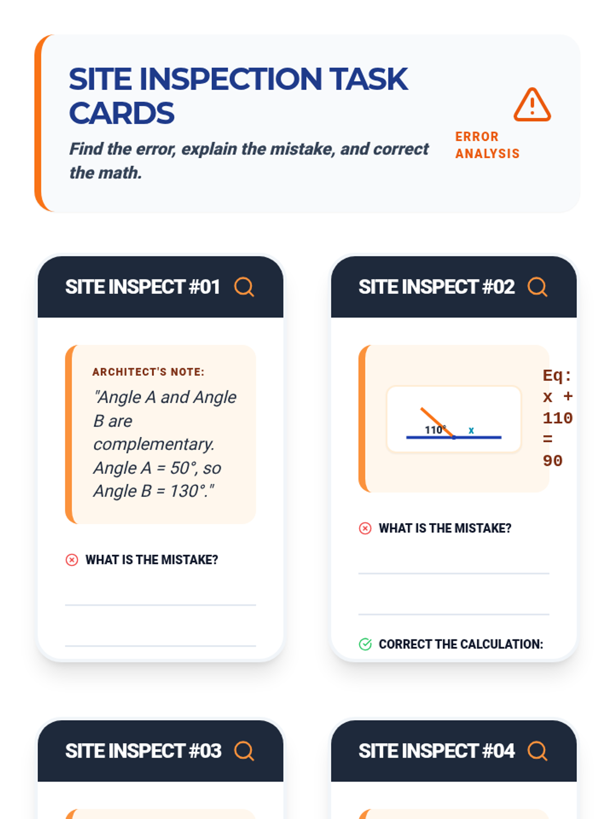A set of 4 error analysis task cards titled 'Site Inspection Task Cards'. Students must identify, explain, and correct common misconceptions and calculation errors regarding angle relationships.