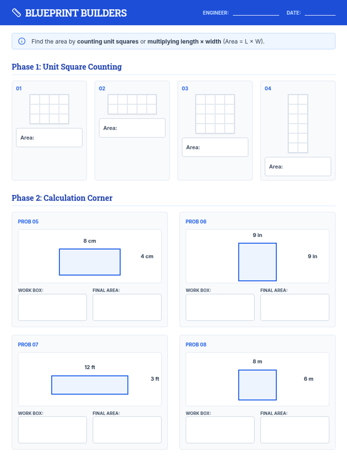 A blueprint-themed worksheet for 5th graders to practice finding the area of rectangles and squares by counting unit squares and multiplying side lengths.