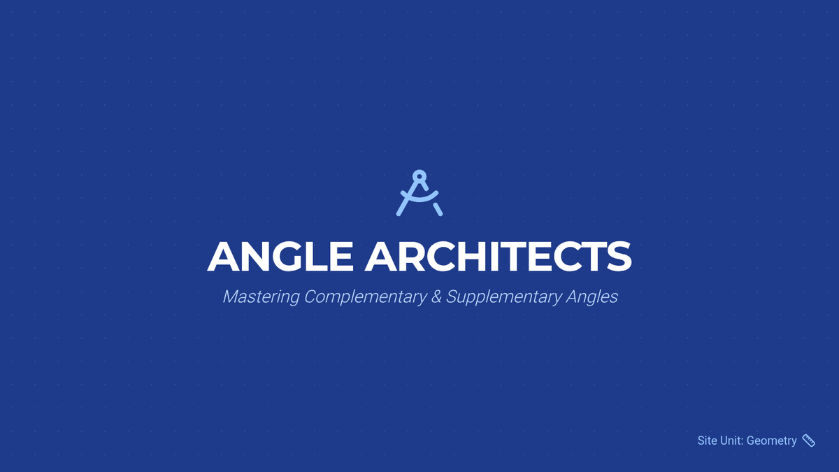 A visually engaging slide deck titled 'Angle Architects' that introduces complementary and supplementary angles using an architecture theme, color-coded diagrams, and memory tricks.