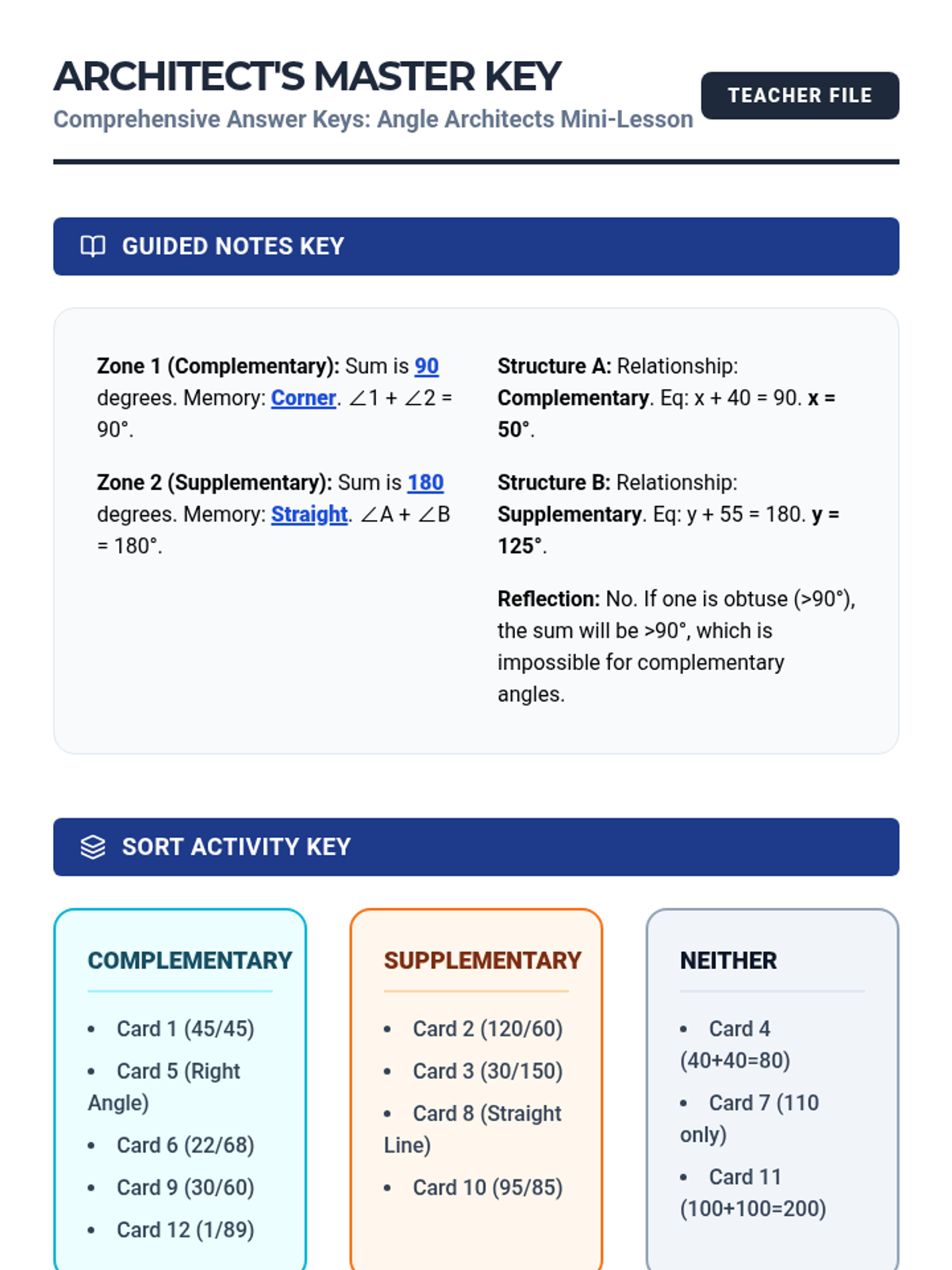 A comprehensive answer key for all materials in the 'Angle Architects' lesson, including guided notes, sorting activity, worksheet, and task cards.