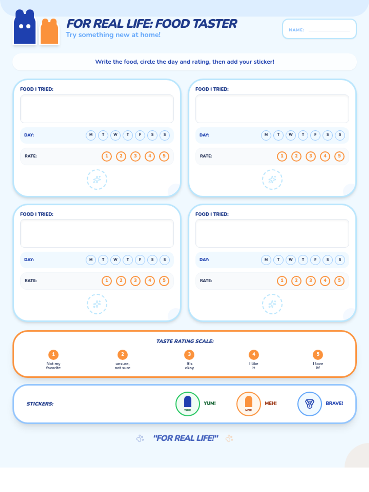 A Bluey-themed food taster sticker chart for home use. Students can write the food they tried, circle the day of the week, and choose from three sticker-style icons (Liked it, Okay, Brave Taster) to record their experience. Reduced size to fit one page.