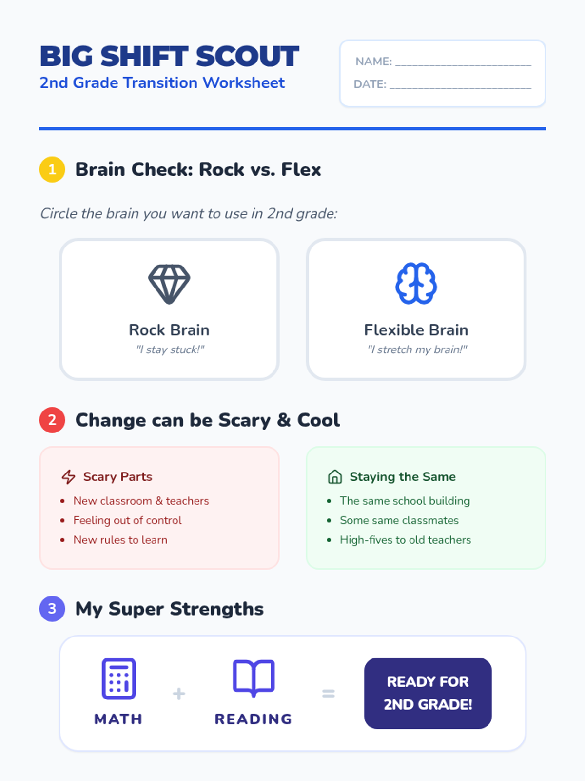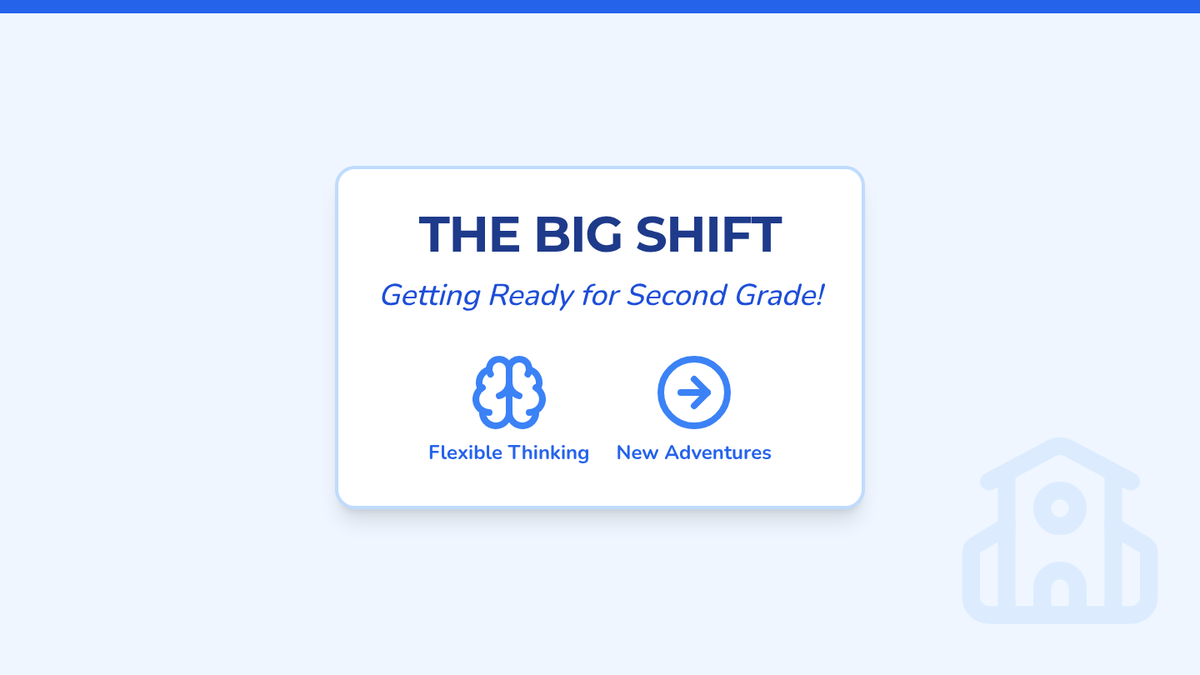 An expanded 11-slide presentation focused on the transition to 2nd grade. It includes slides on managing anxiety about change, identifying consistent support systems (including Ms. Vajirasan), and celebrating academic strengths in math and reading.