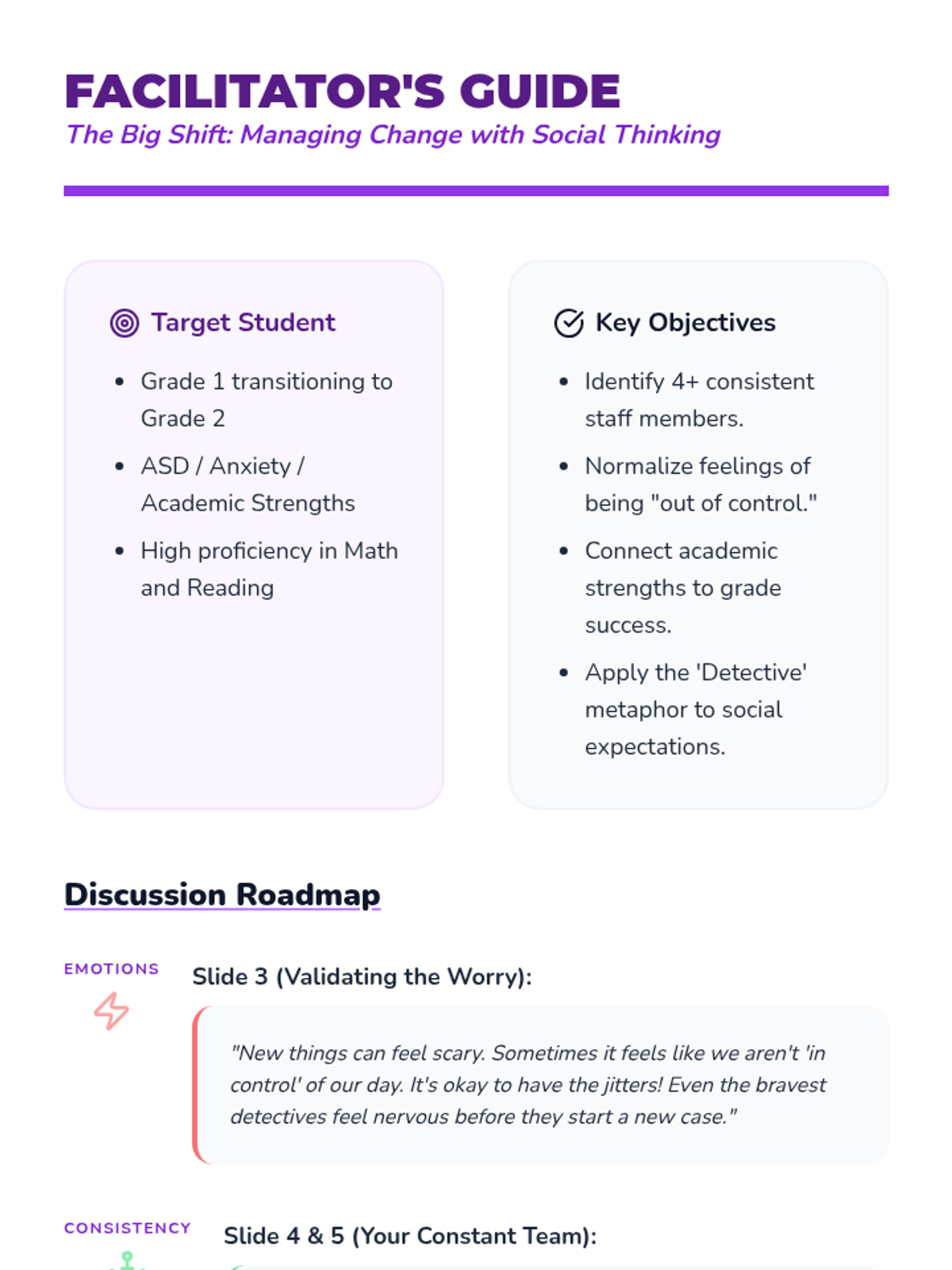 Updated facilitator's guide with expanded scripts for addressing feelings of being "out of control," reinforcing consistent support systems (Ms. Vajirasan), and leveraging the student's academic strengths.