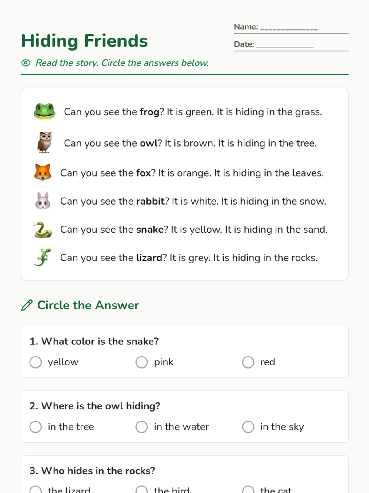 A kindergarten reading passage about camouflage with comprehension questions. Fits on a single page. Revised for answer choice uniformity and alignment.