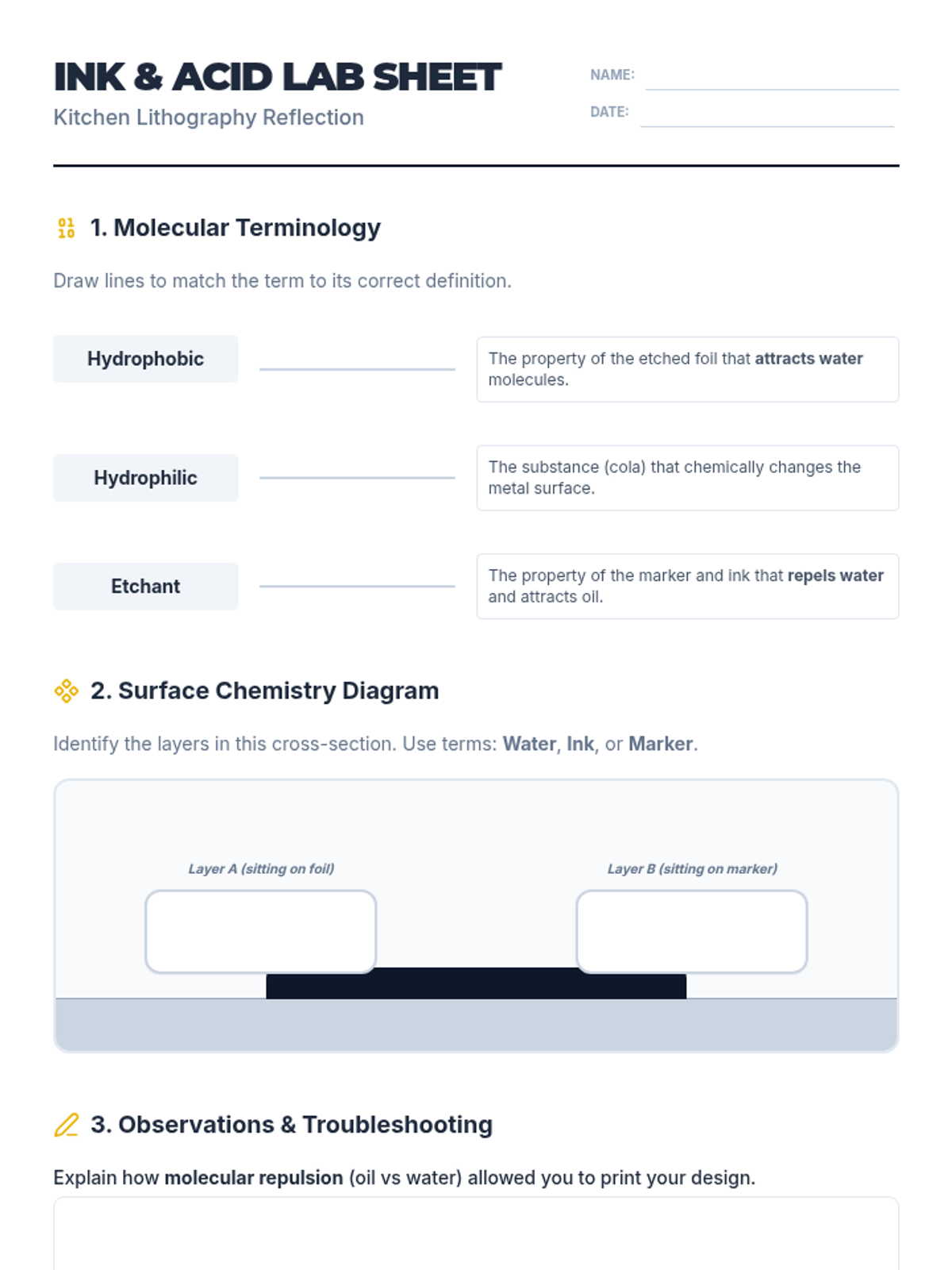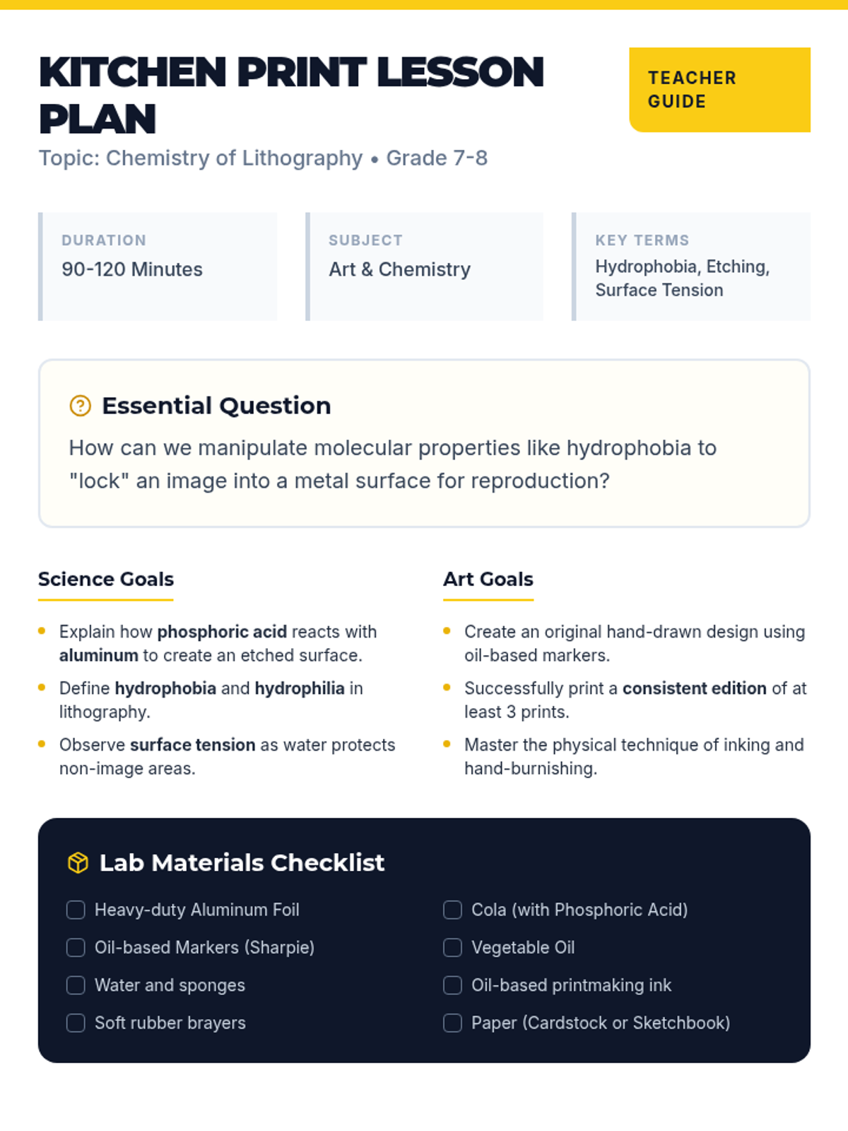 A comprehensive lesson plan for teachers detailing the chemistry and artistic process of kitchen lithography. Includes learning objectives, materials checklists, step-by-step instructional sequence, and troubleshooting tips.