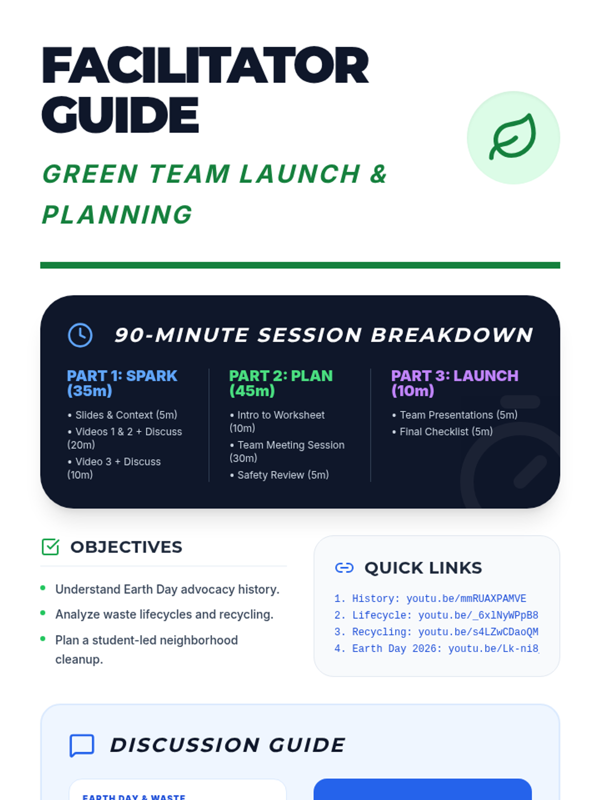 A comprehensive facilitator guide for teachers to lead the Earth Day cleanup project. Includes objectives, video discussion prompts, safety protocols, and team meeting tips.
