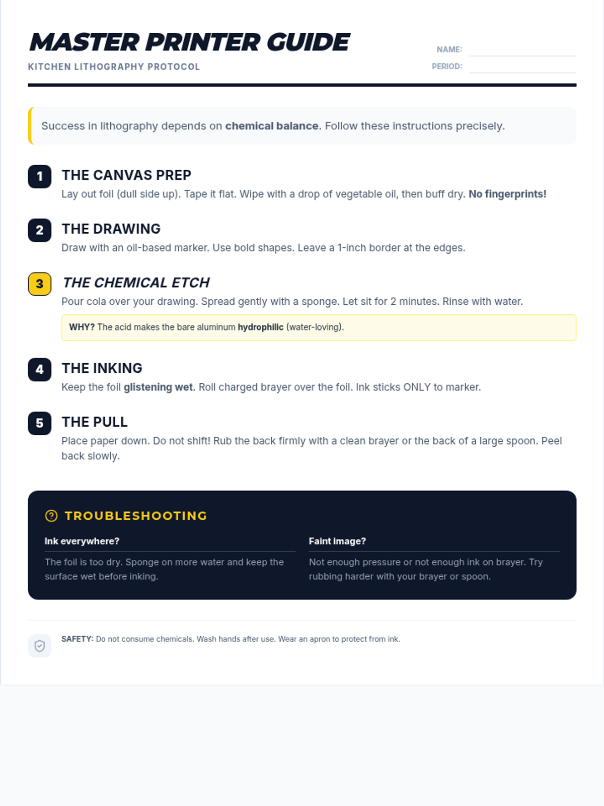 A step-by-step student activity guide for the kitchen lithography process. Includes visual cues, "pro tips," and chemical explanations for each stage of preparing, etching, and printing.