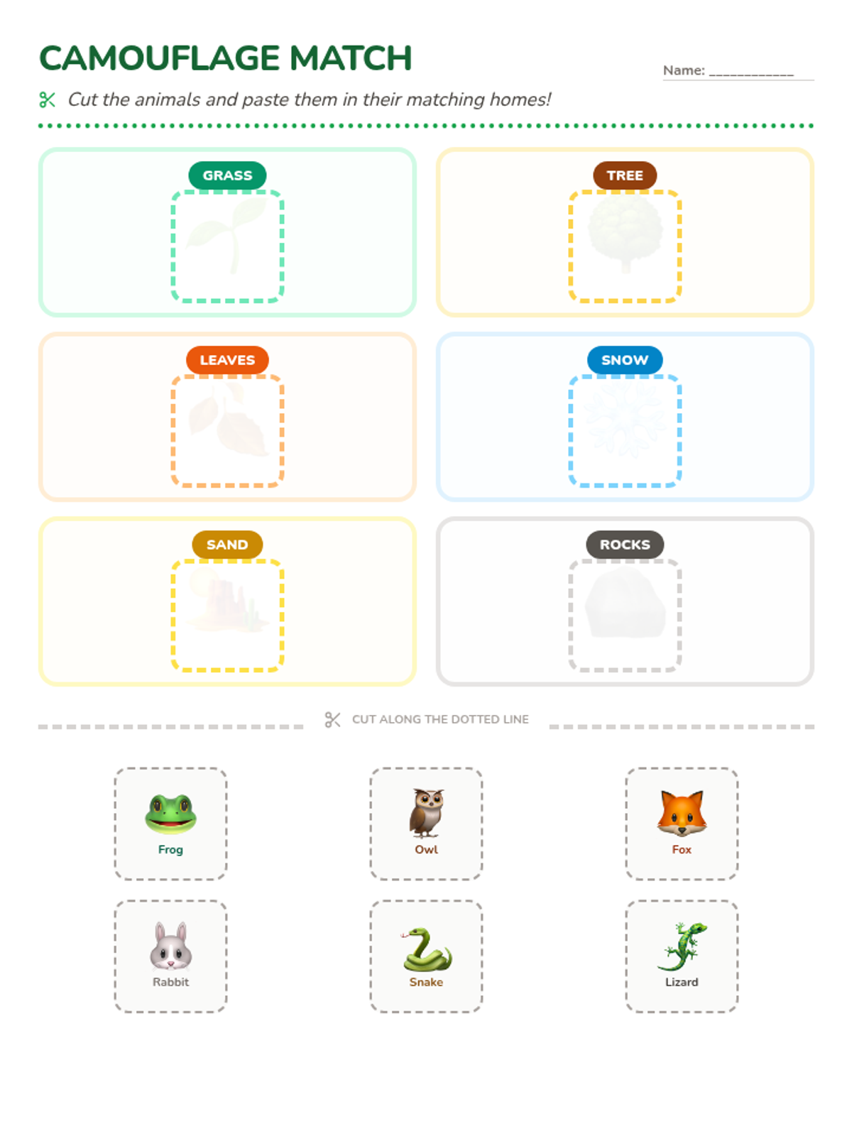 A cut-and-paste activity for kindergarten students to match animals to their camouflaged habitats. Revised to fix logical matches and improve visual patterns.