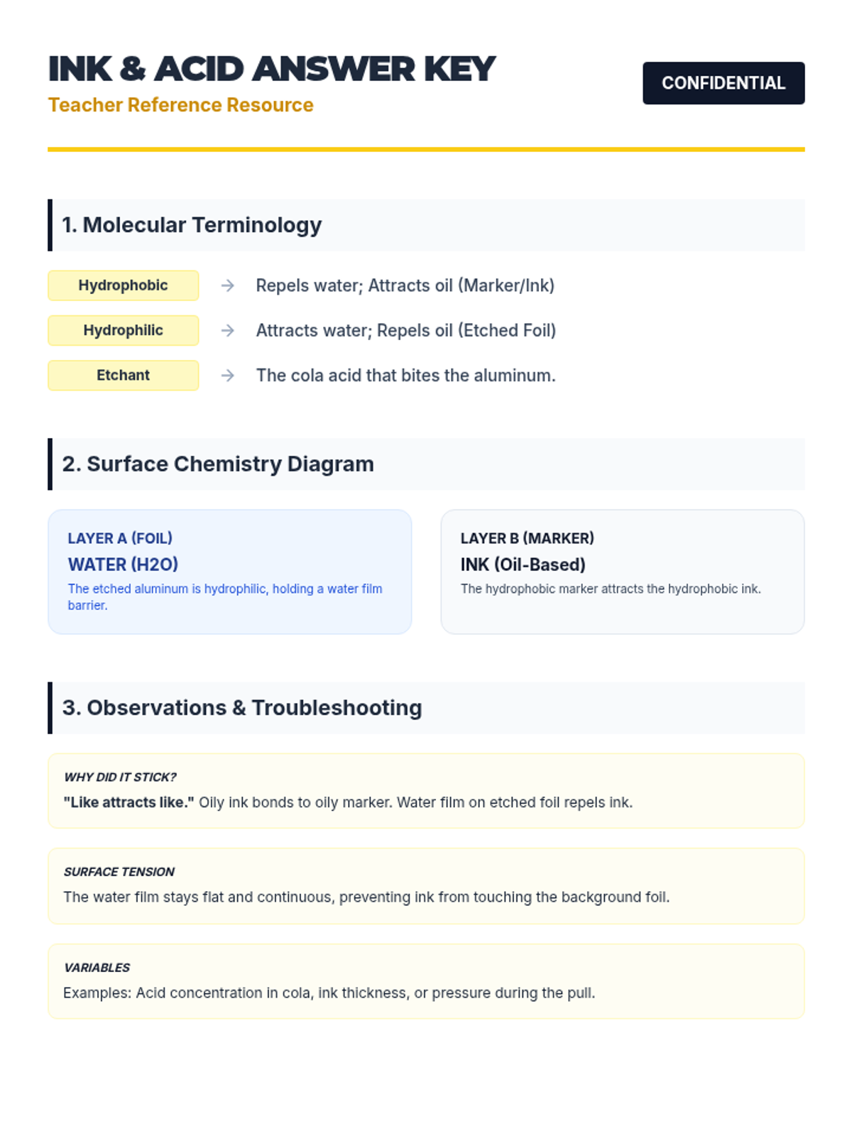 The teacher's answer key for the Ink and Acid Worksheet, providing correct scientific terminology, diagram labels, and sample high-quality reflection responses.