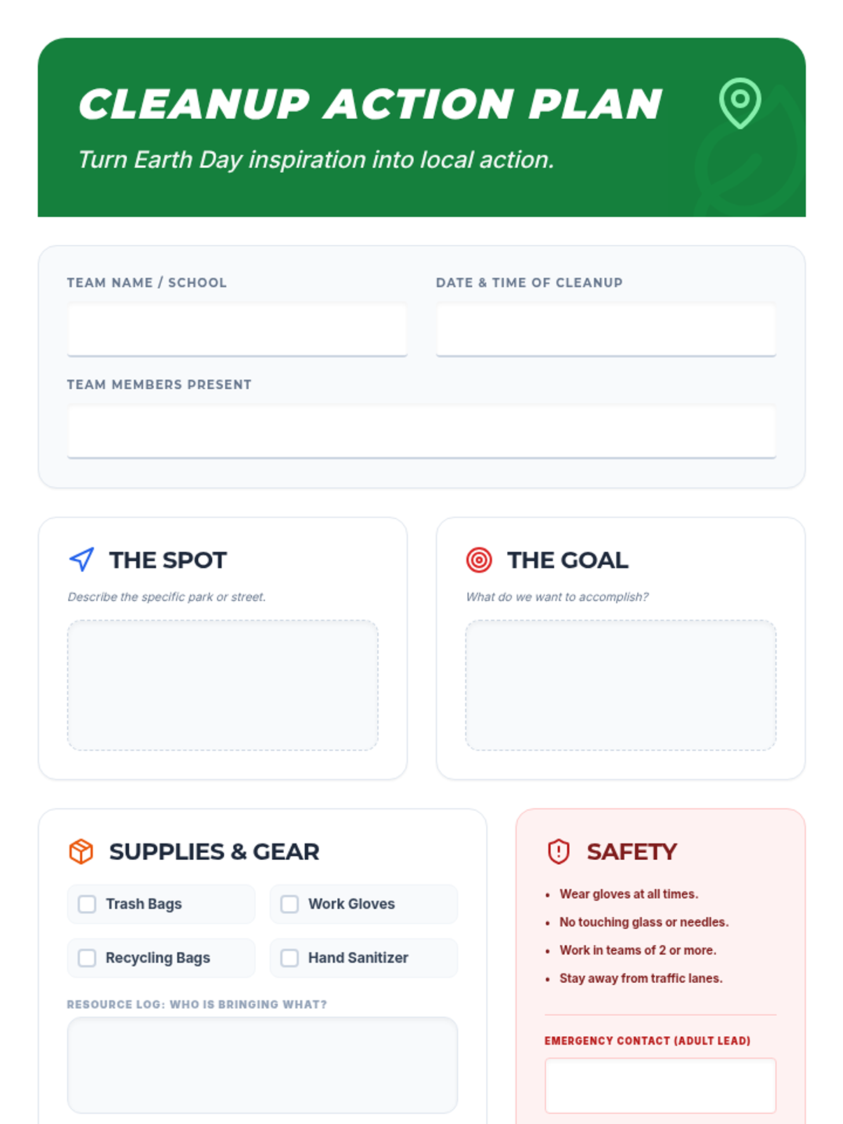 A practical meeting guide for students to organize their community cleanup. Includes sections for team goal-setting, role assignment, supply checklists, safety protocols, and recruitment strategies.