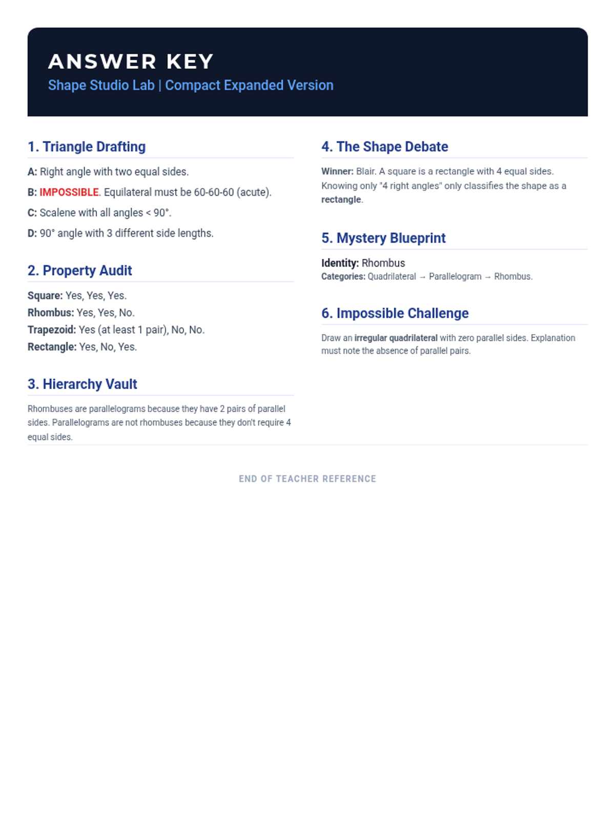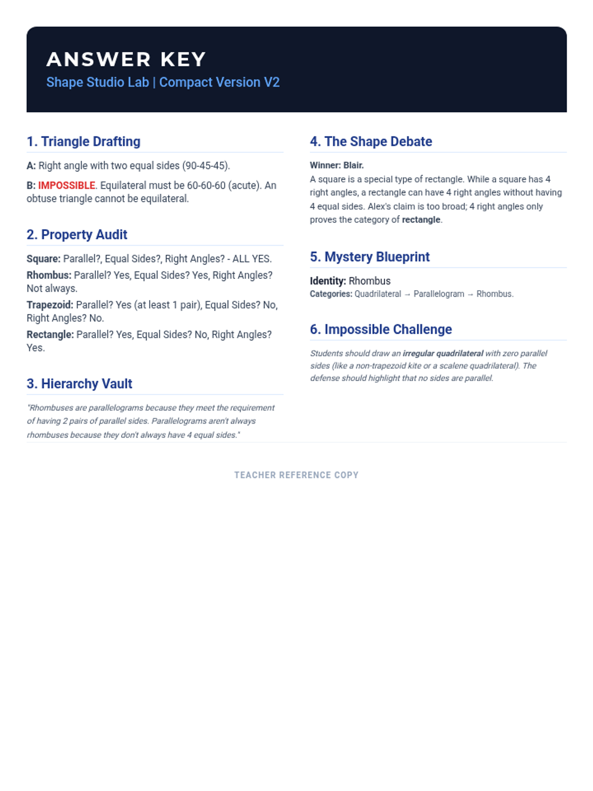 Condensed 1-page teacher answer key for the revised compact worksheet (V2), providing solutions for drafting (2 triangles), property audits, and reasoning tasks without the hierarchy map.