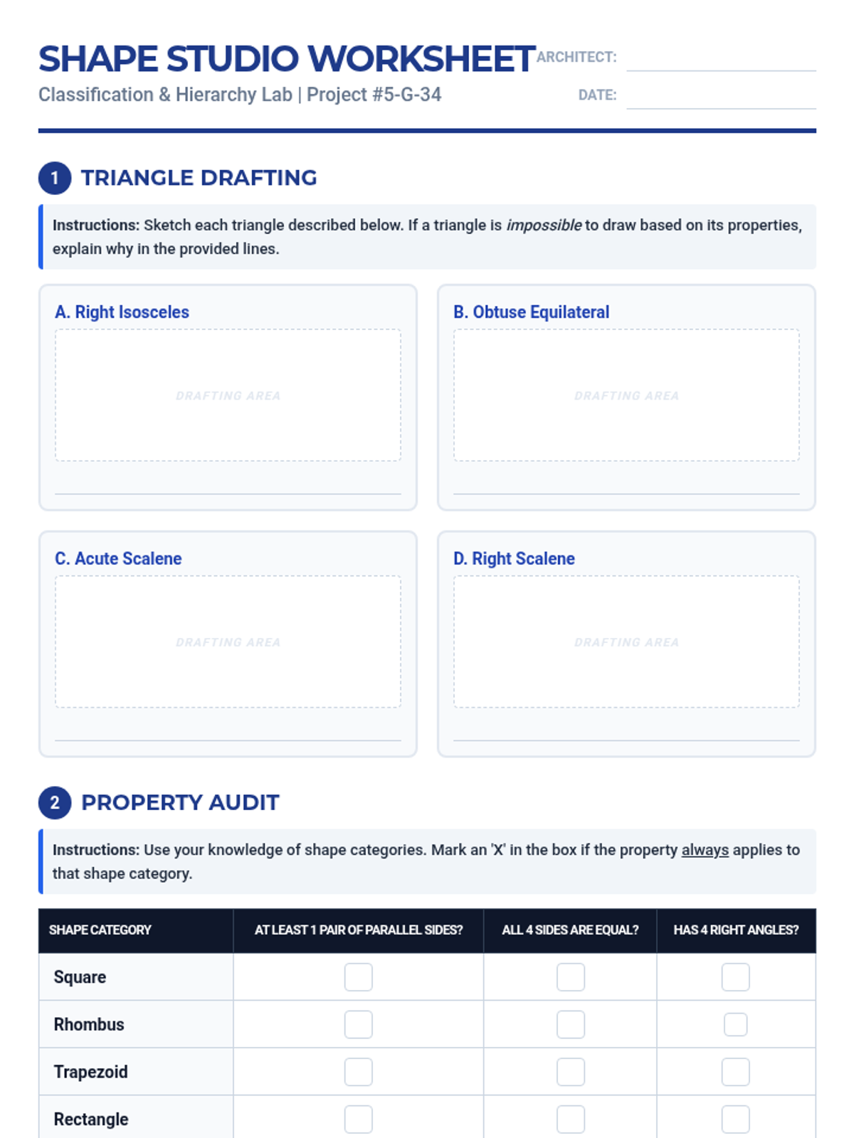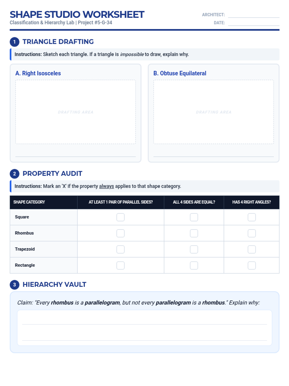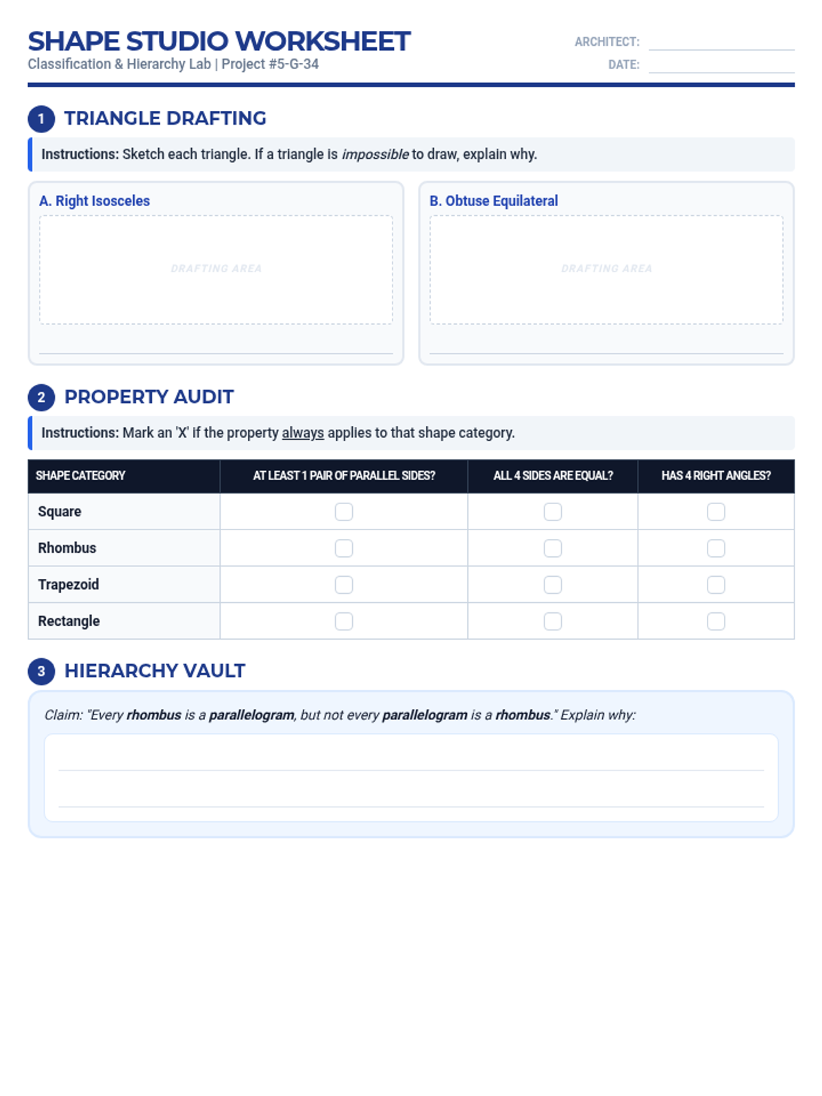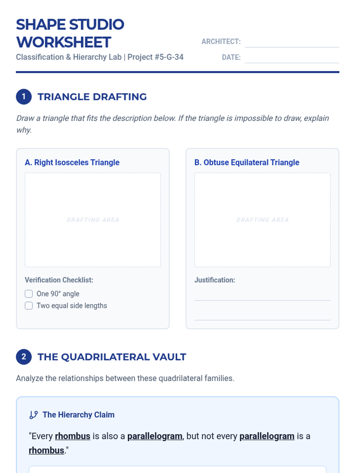 An open-ended geometry worksheet for 5th graders focused on classifying triangles and quadrilaterals through drafting, hierarchy mapping, and logical arguments.
